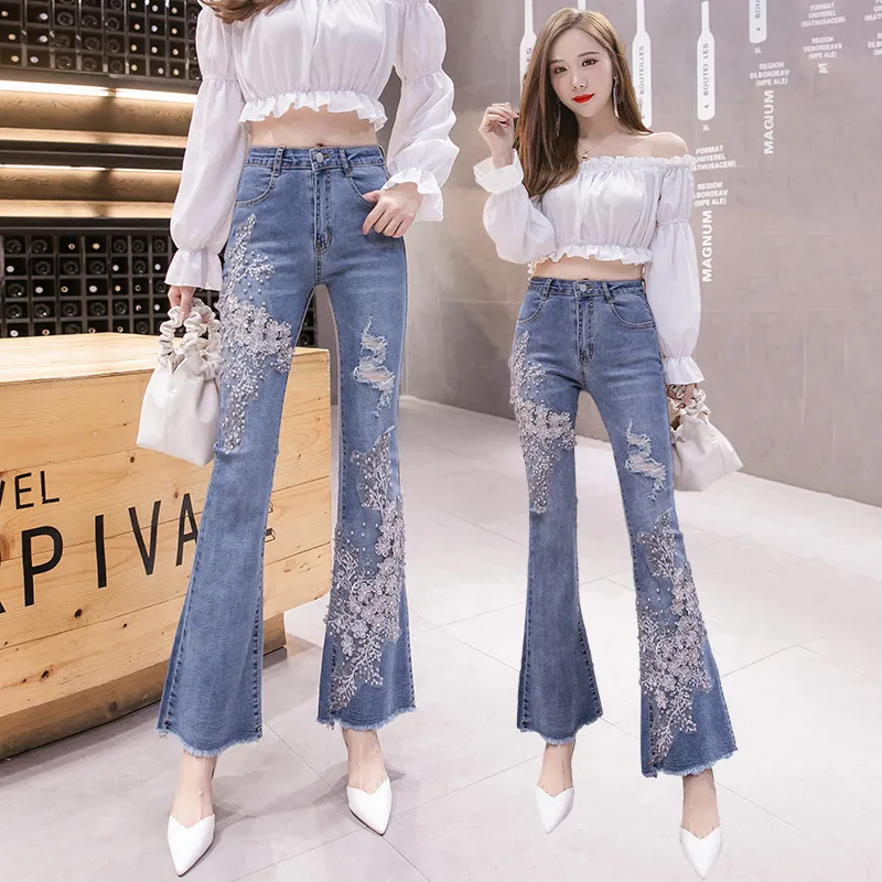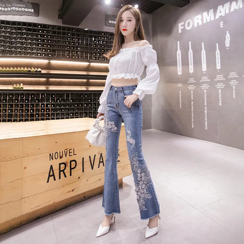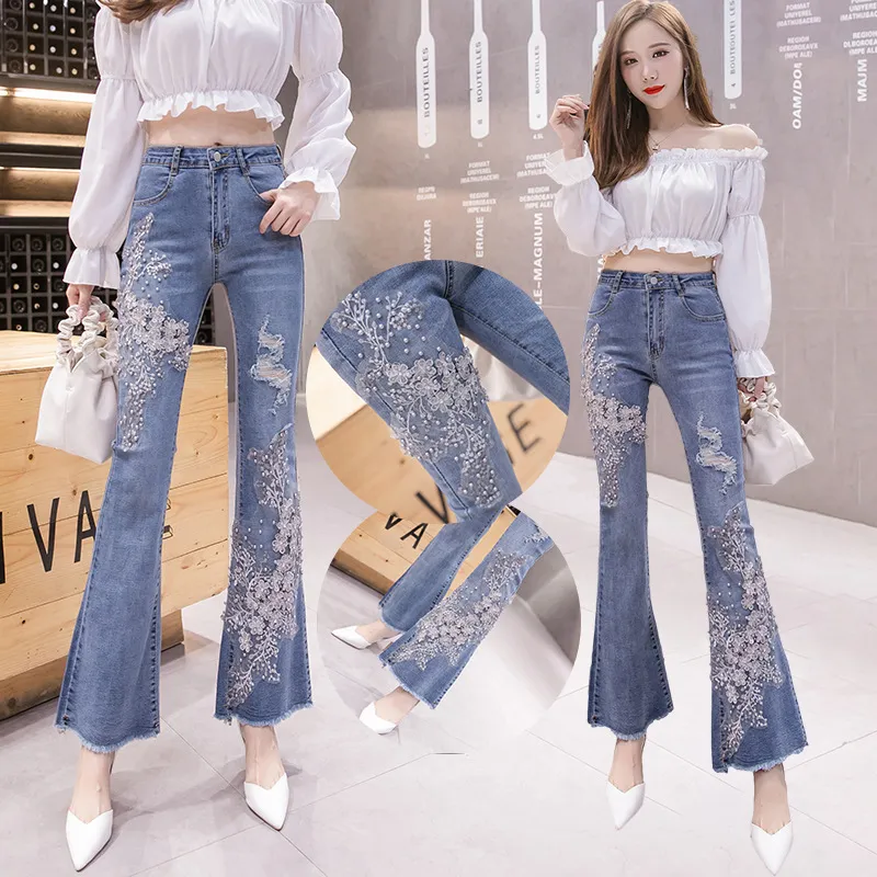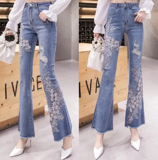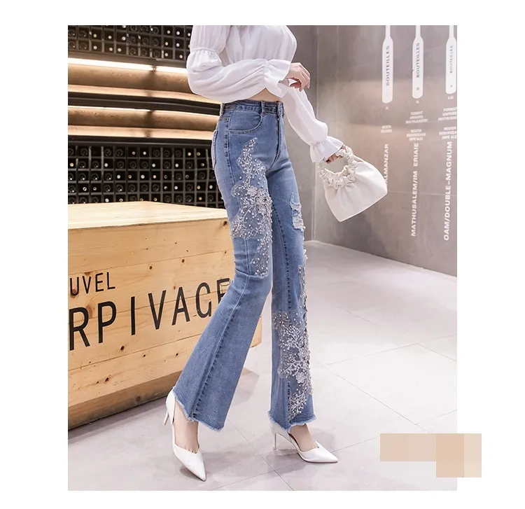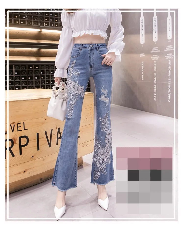 衣都精品- 2022冬季新款重工刺繡釘珠碎花高腰牛仔褲