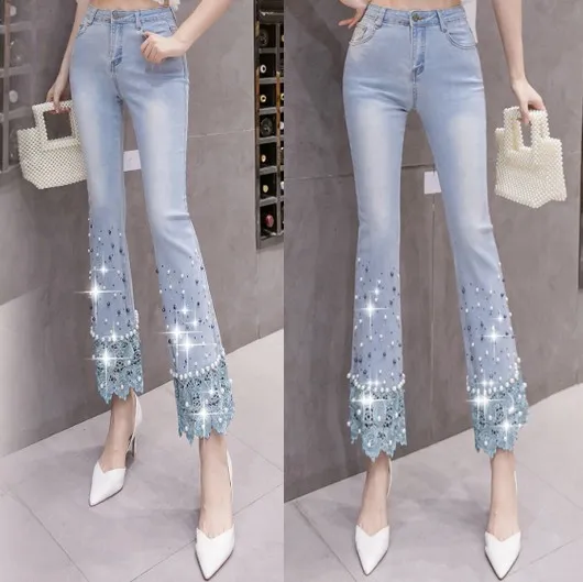 衣都精品- 2022冬季新款重工刺繡釘珠碎花高腰牛仔褲
