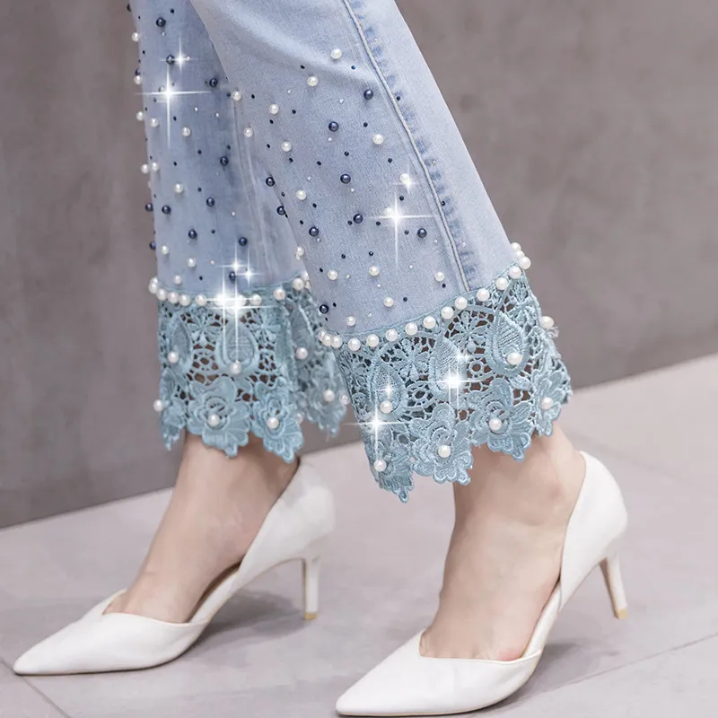衣都精品- 2022冬季新款磨白水洗刺繡蕾絲花朵牛仔褲