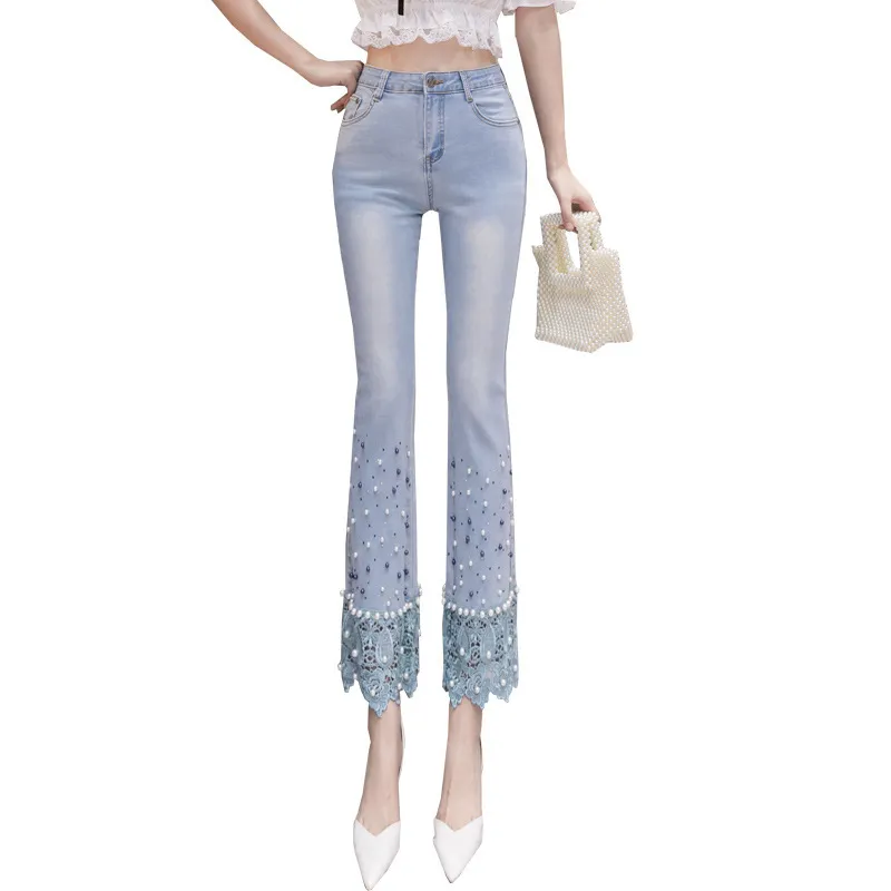 衣都精品- 2022冬季新款褲腳蕾絲荷葉邊拼接牛仔褲