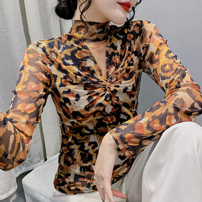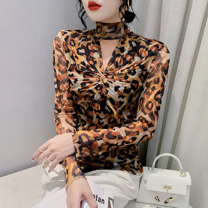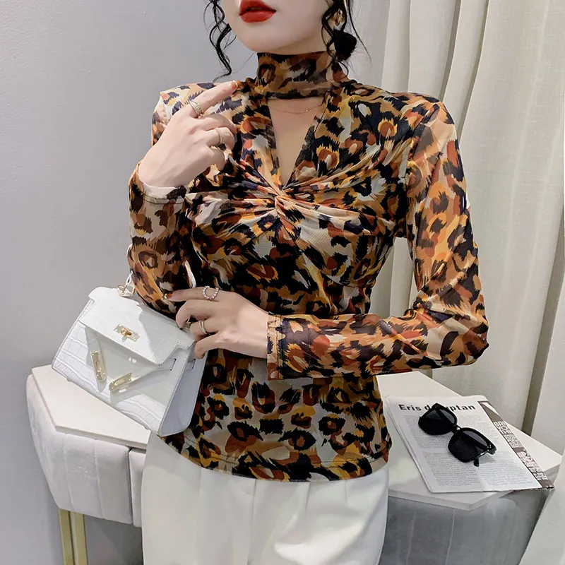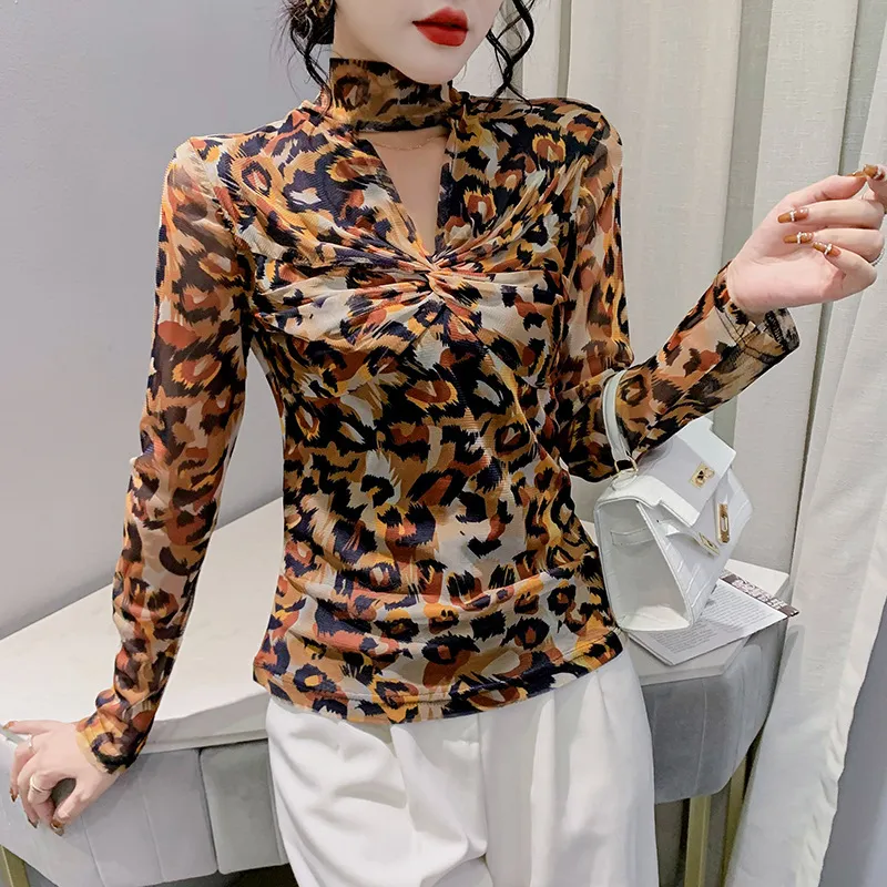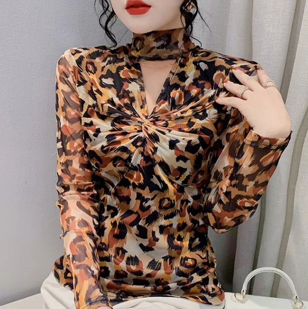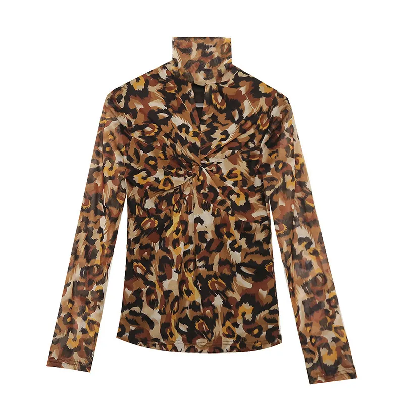 衣都精品- 2022冬季新款歐美風高領鏤空彩色豹紋上衣