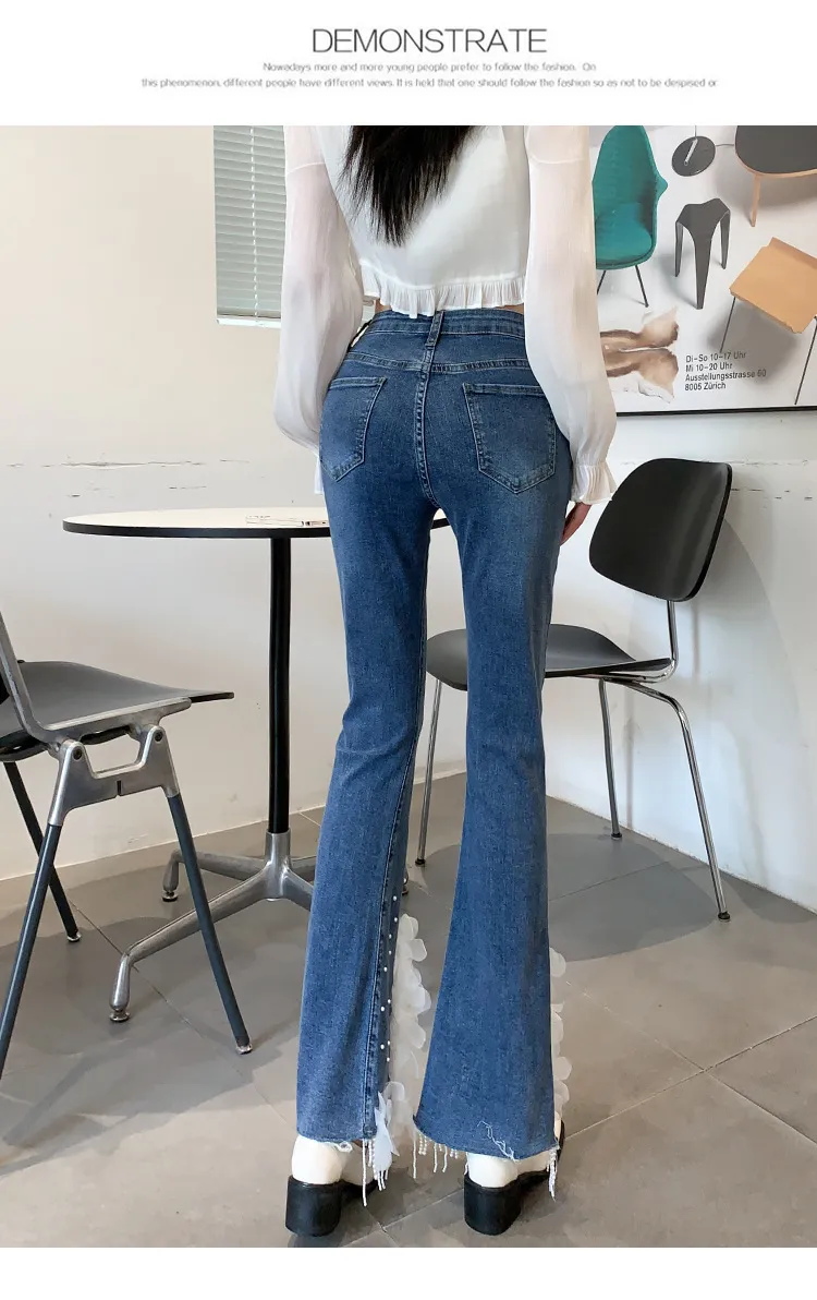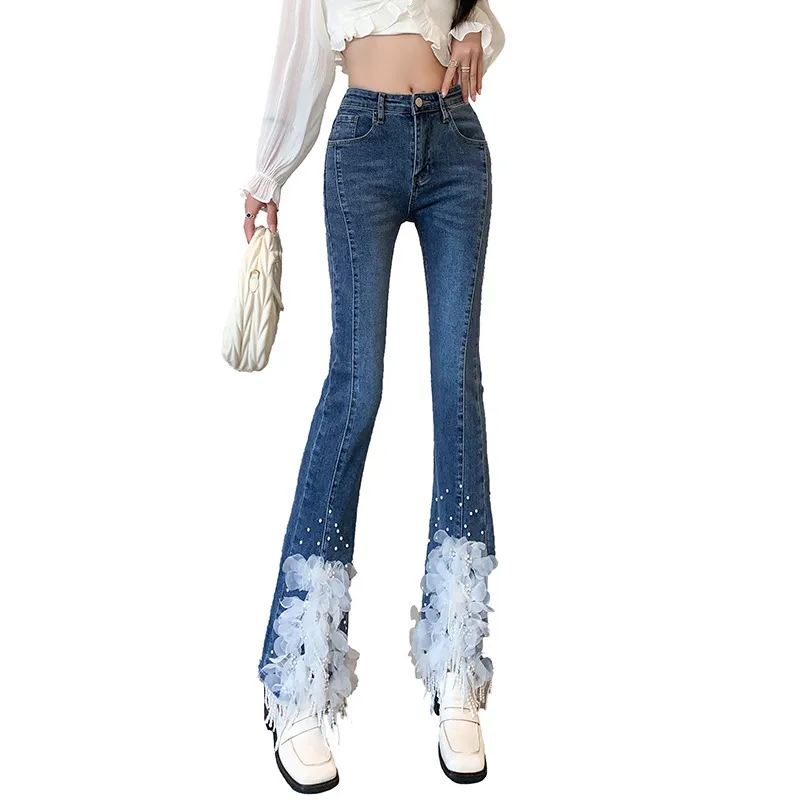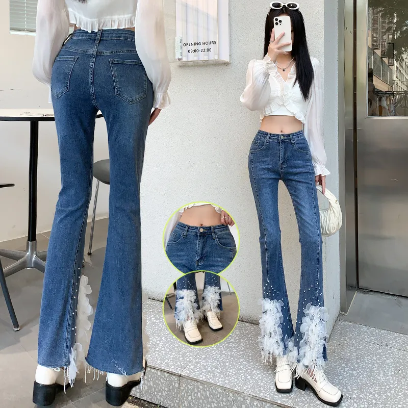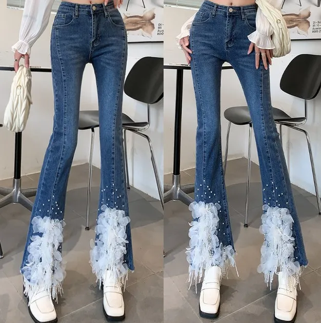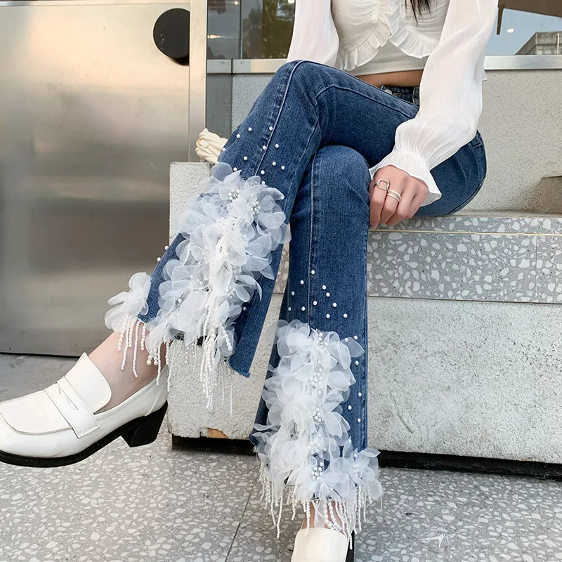 衣都精品- 2023新款重工珍珠流蘇白色立體花朵牛仔褲
