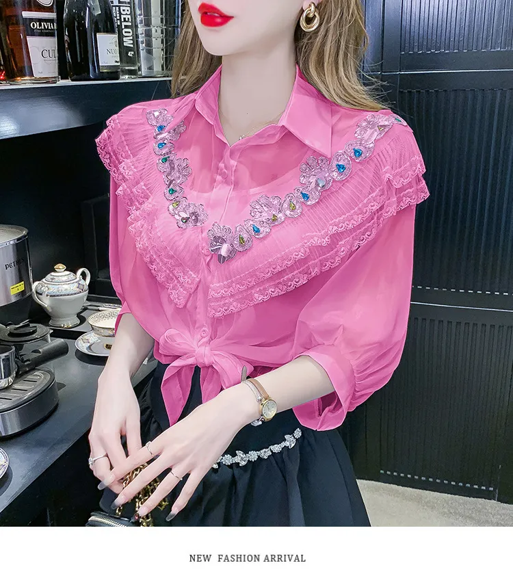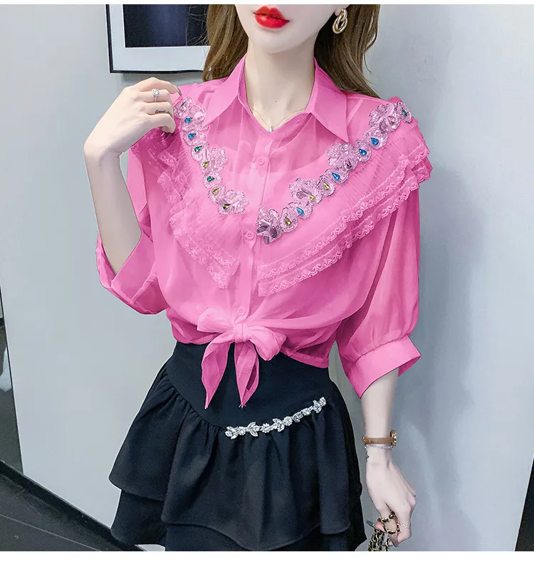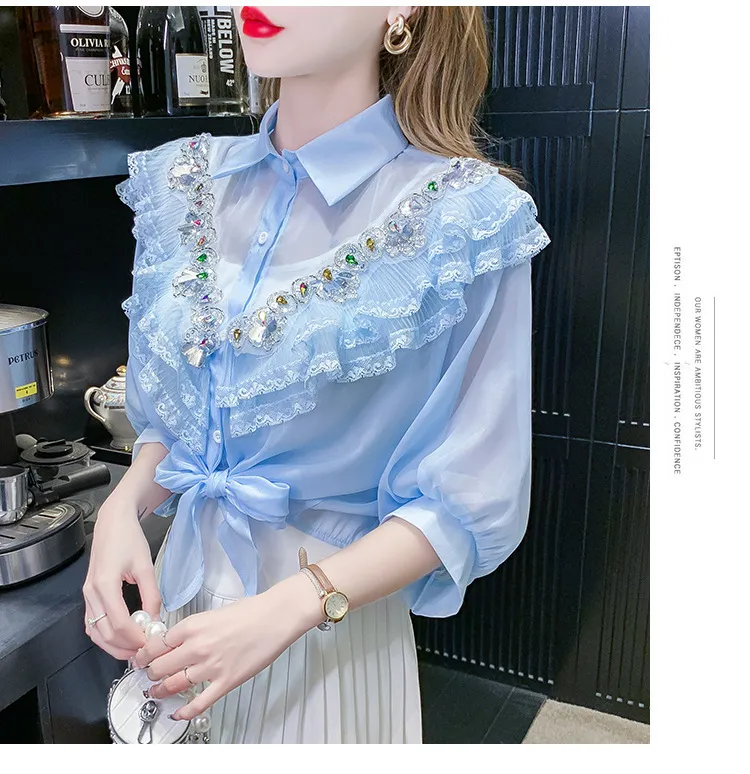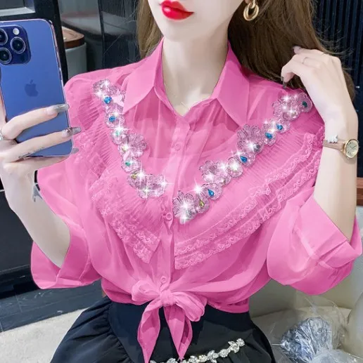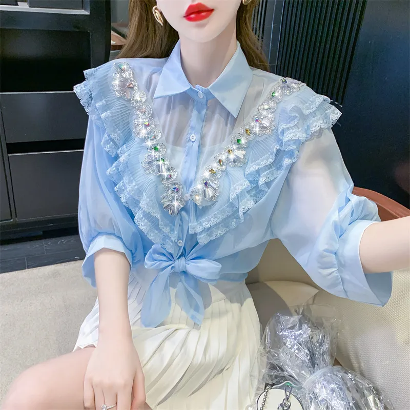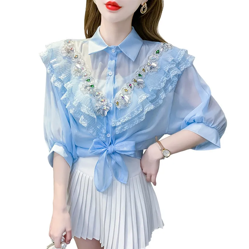 衣都精品- 2023新款重工鑲鑽五分中袖荷葉邊上衣