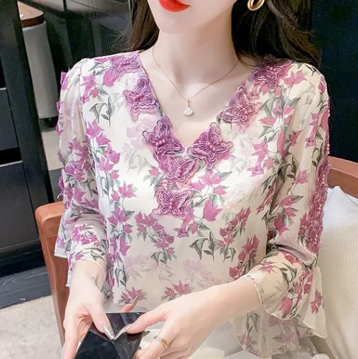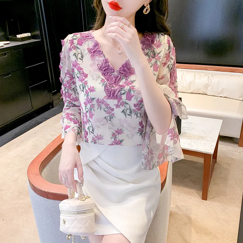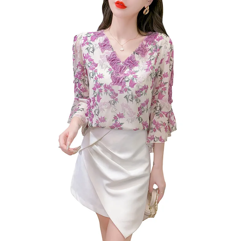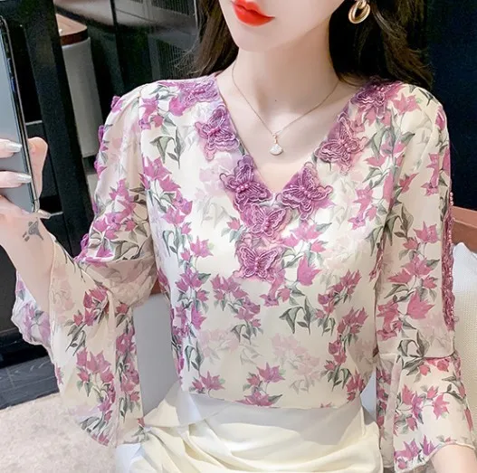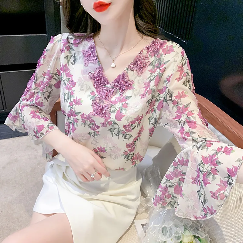 衣都精品- 2023新款田園風紫色碎花七分喇叭袖上衣