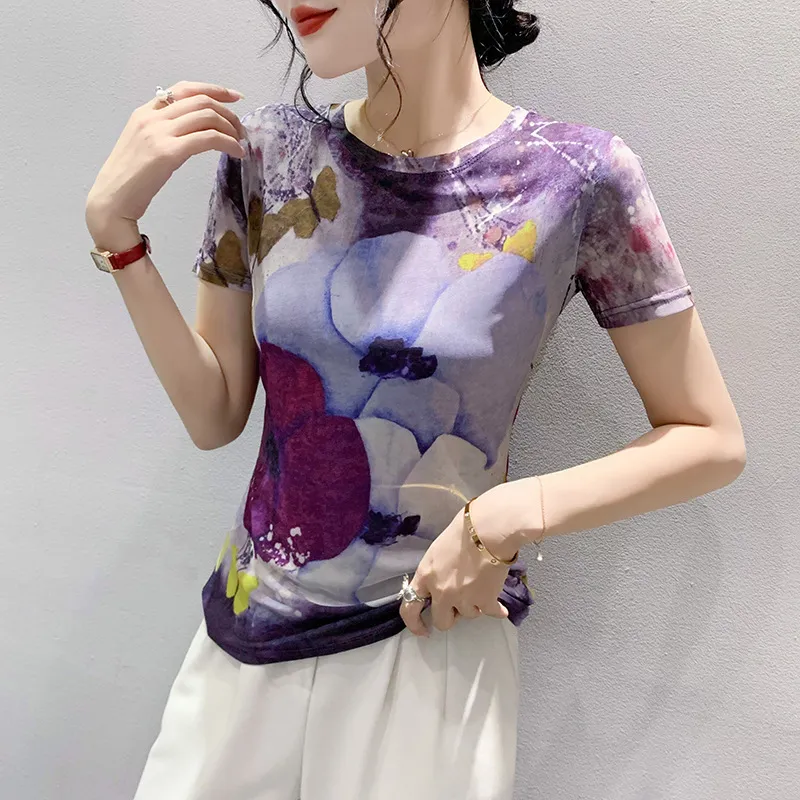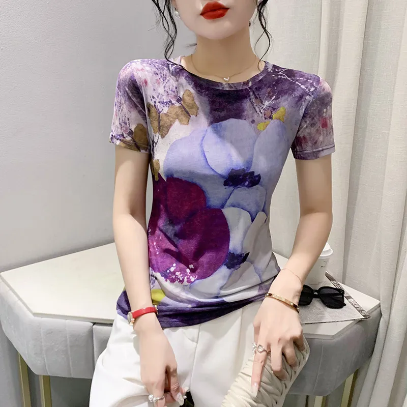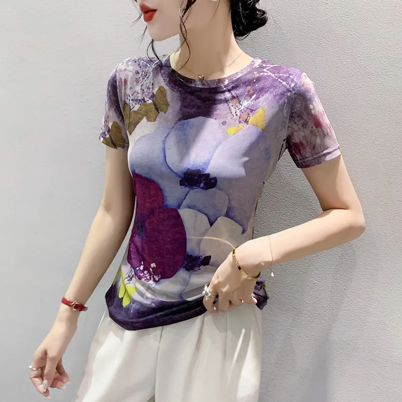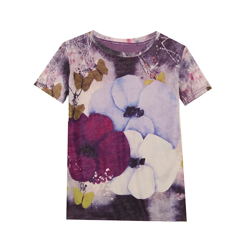 衣都精品- 2023新款夏季紫色大花朵圓領短袖撞色上衣