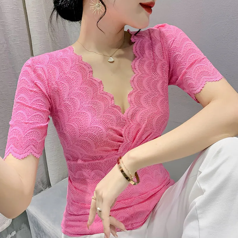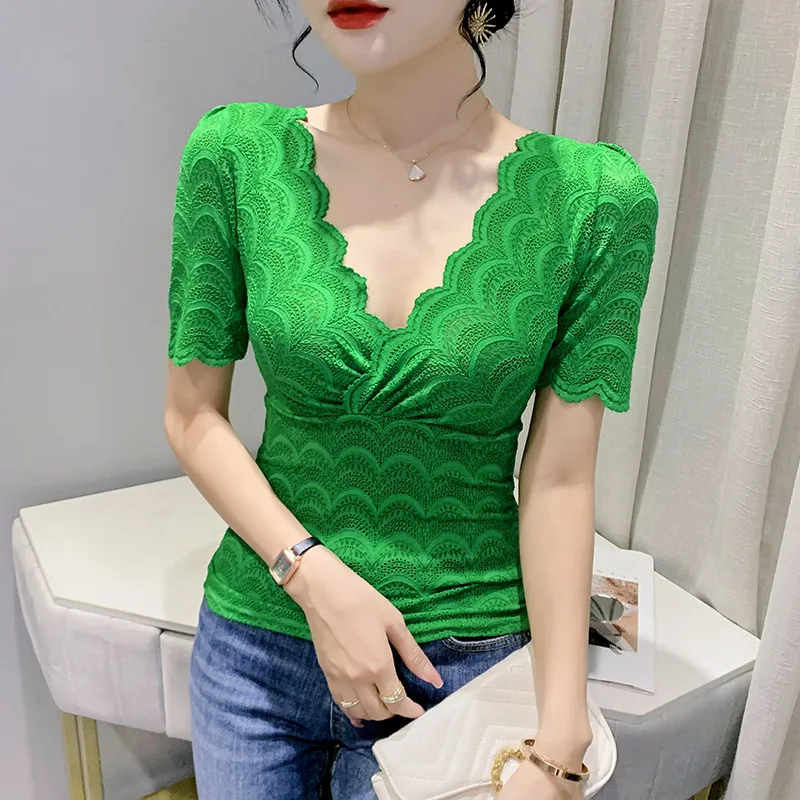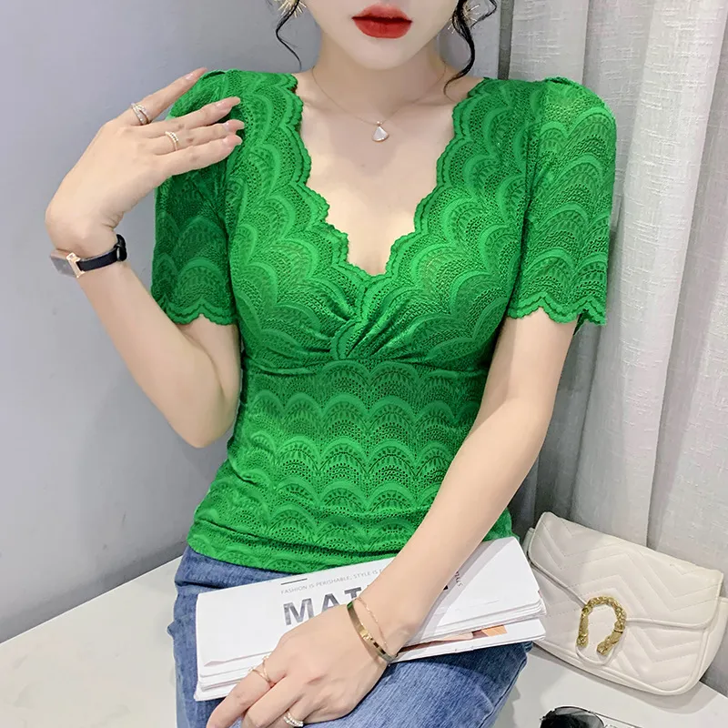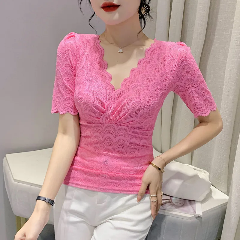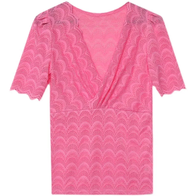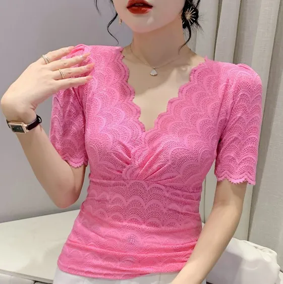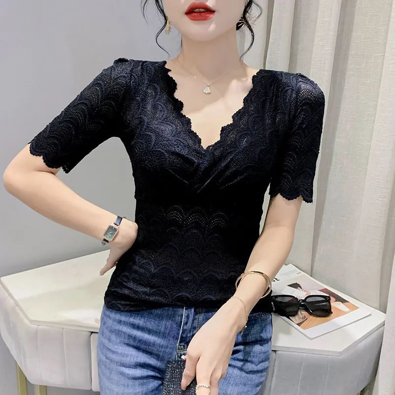 衣都精品- 2023新款花邊V領蕾絲鏤空顯白收腰上衣