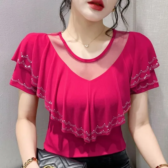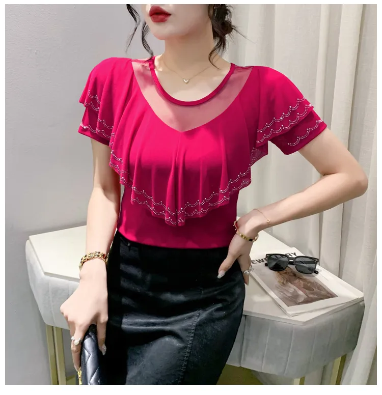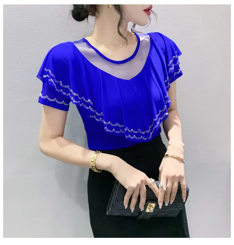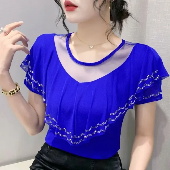 衣都精品- 2023新款超美荷葉邊帶鑽網紗拼接上衣