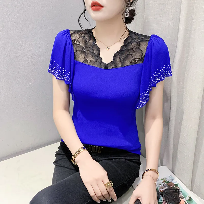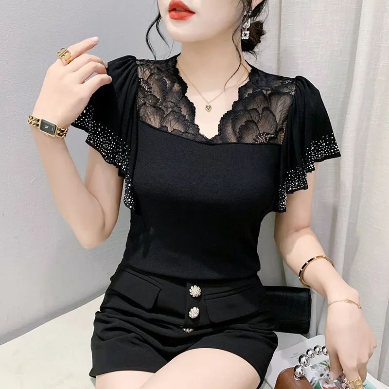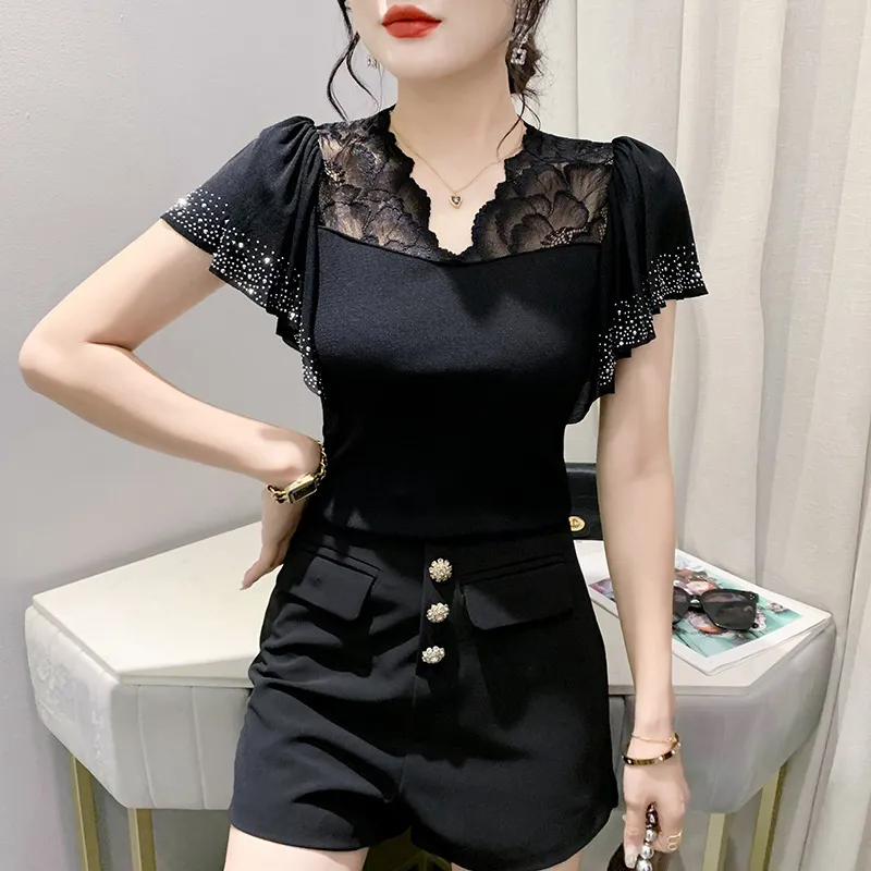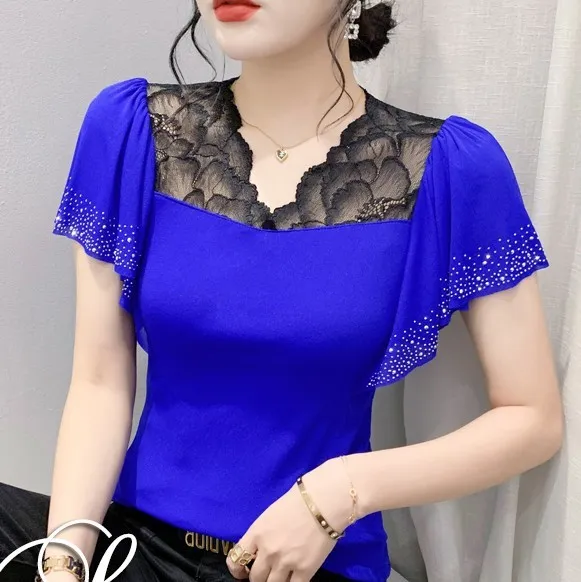 衣都精品- 2023新款超美荷葉邊帶鑽網紗拼接上衣