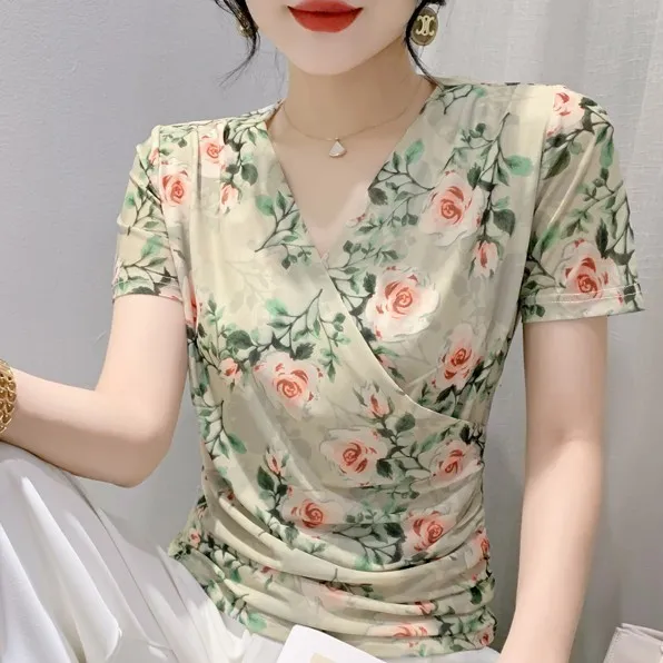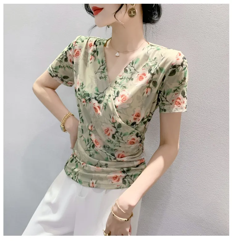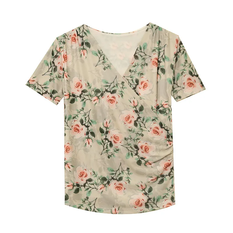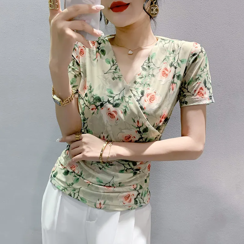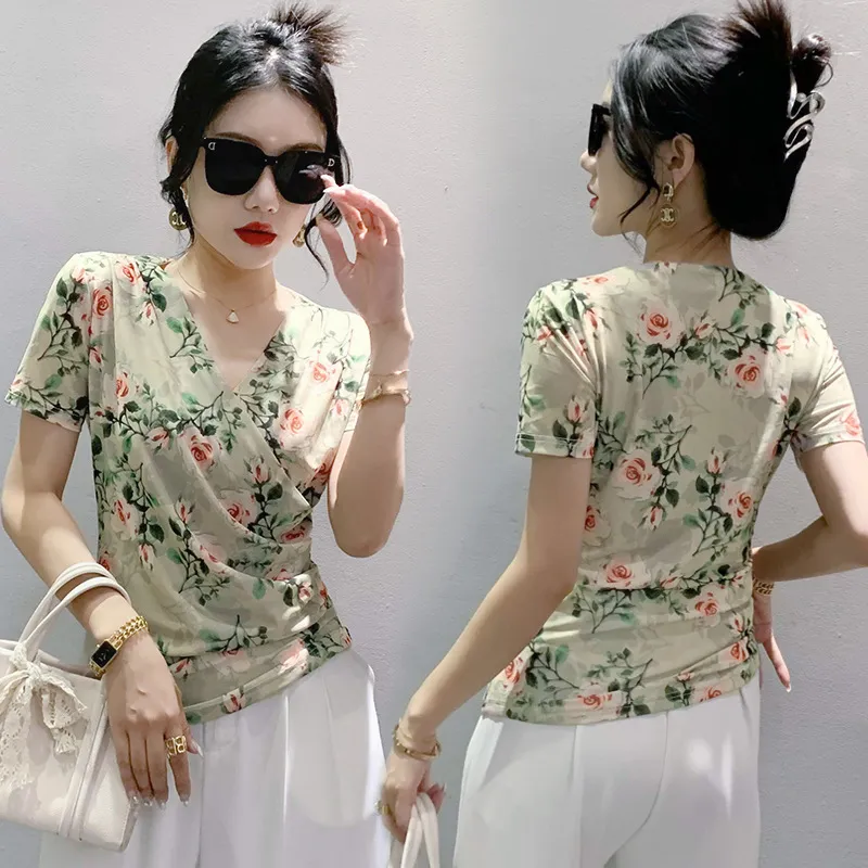 衣都精品- 2023新款田園風小碎花V領褶皺上衣
