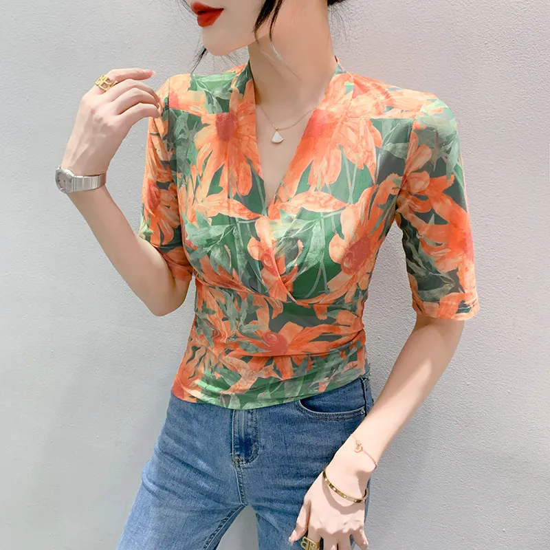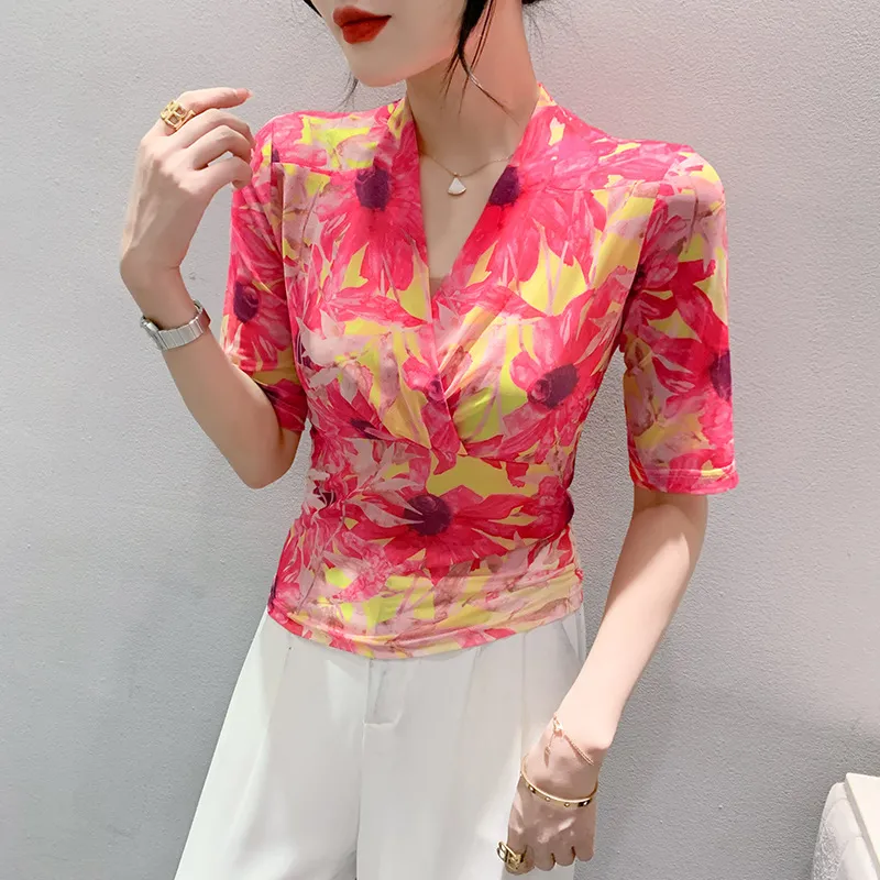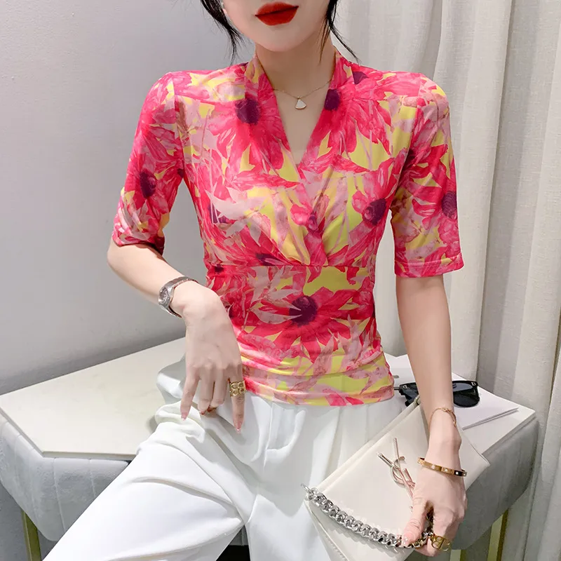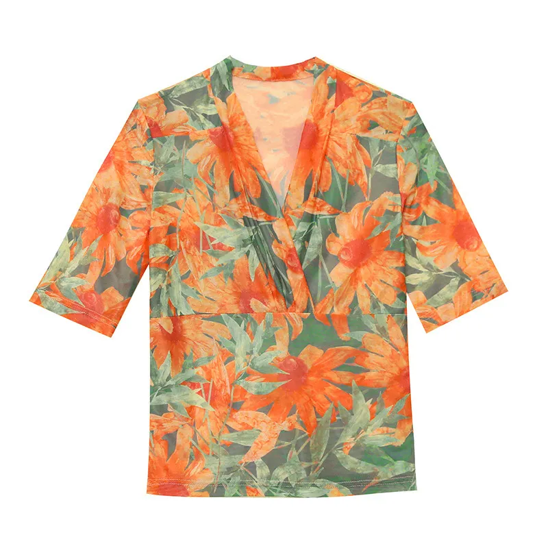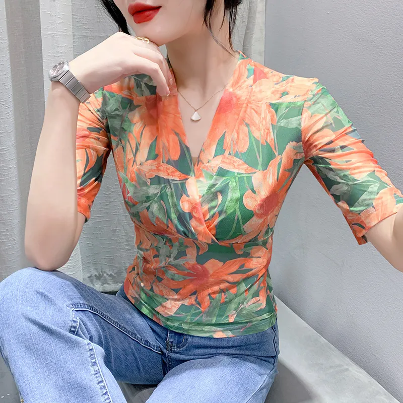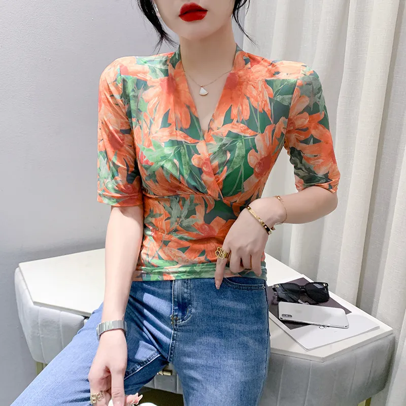 衣都精品- 2023新款輕熟風鮮豔印花V領五分袖上衣