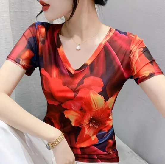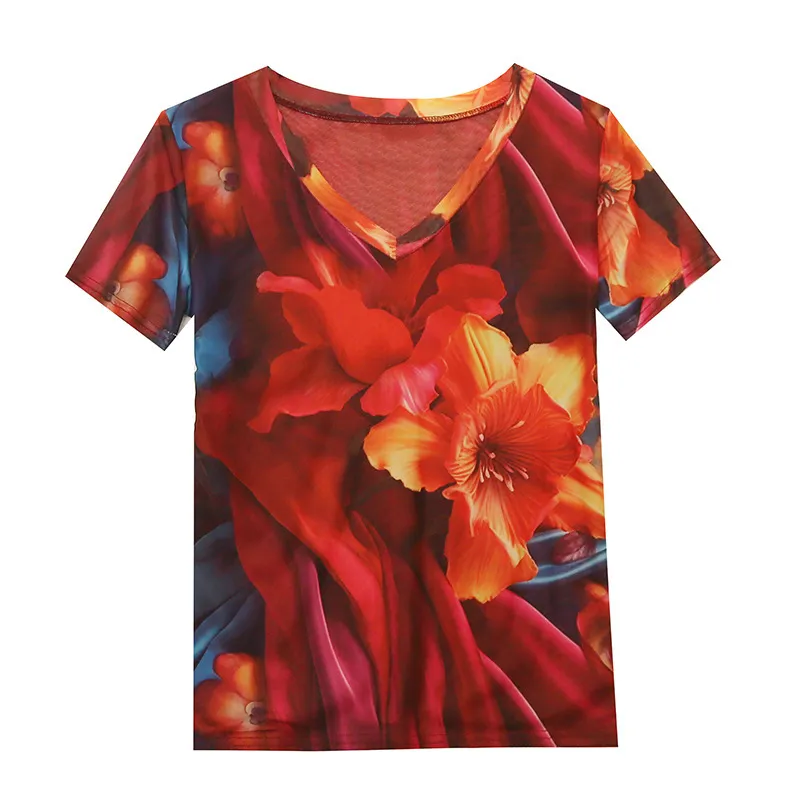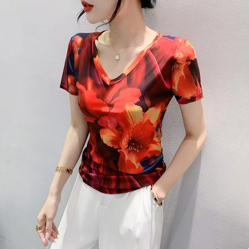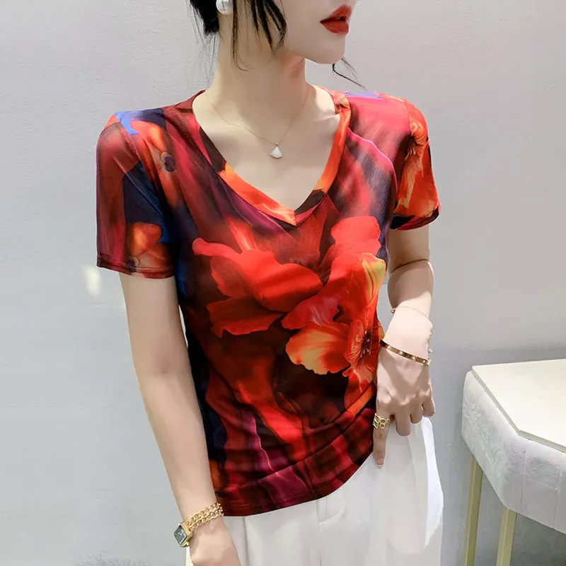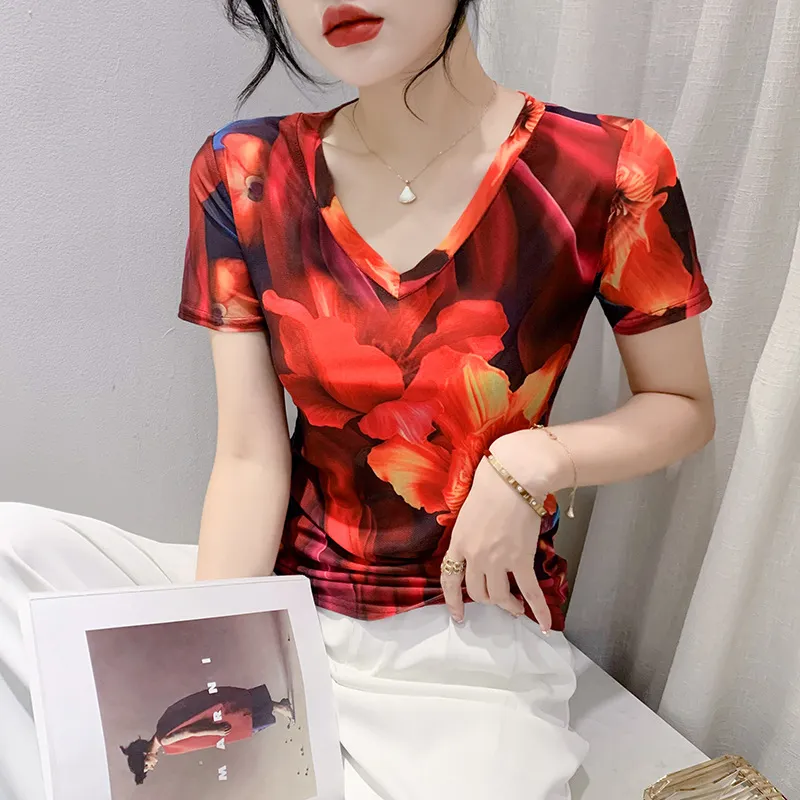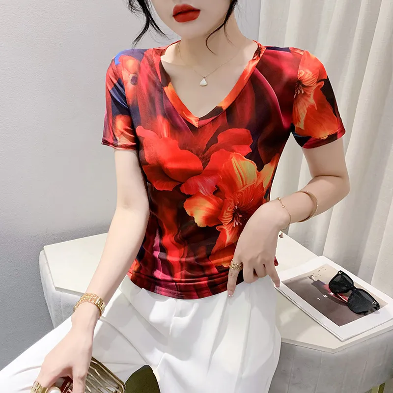 衣都精品- 2023新款輕熟風鮮豔印花V領五分袖上衣