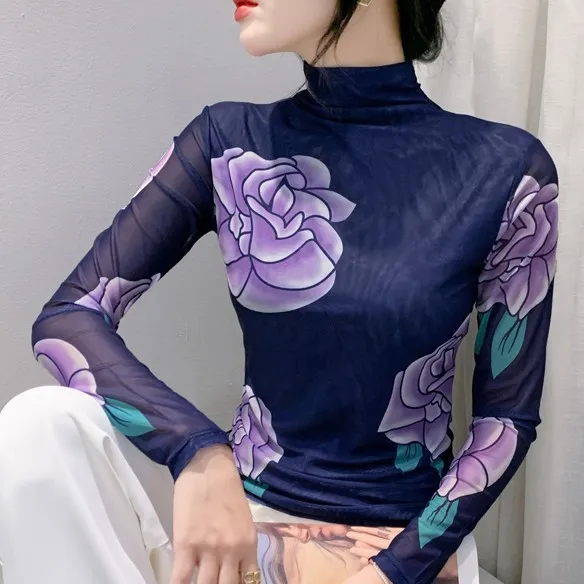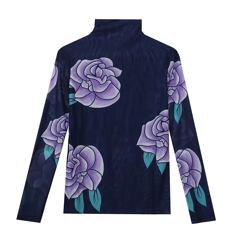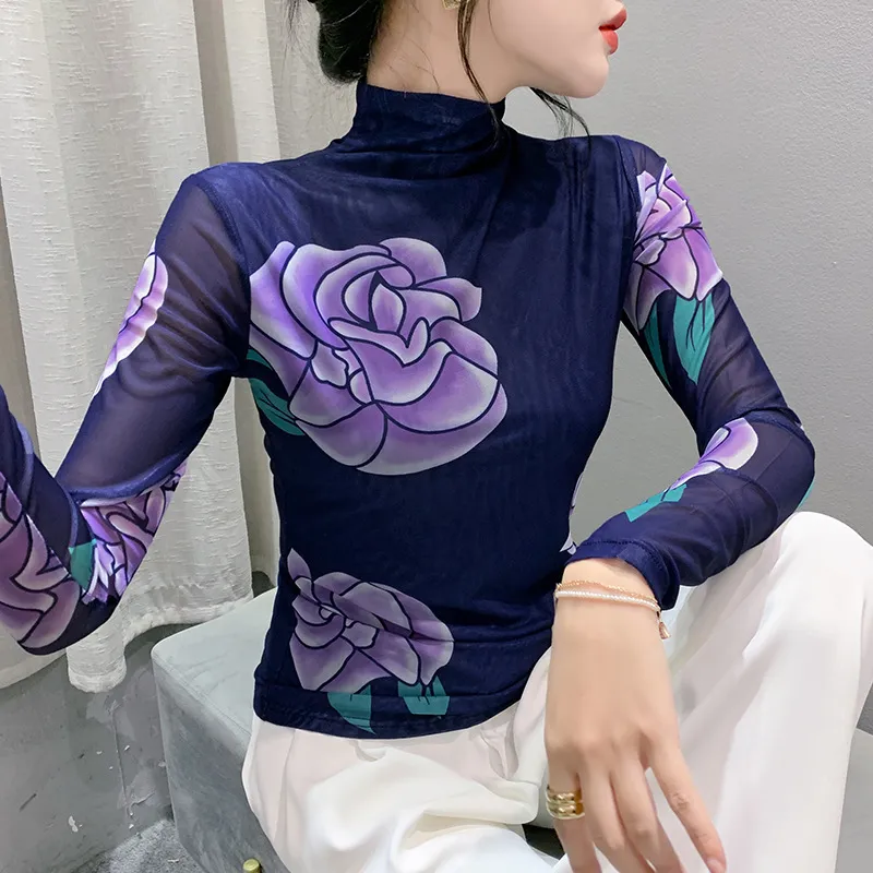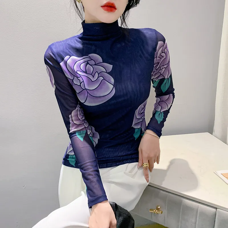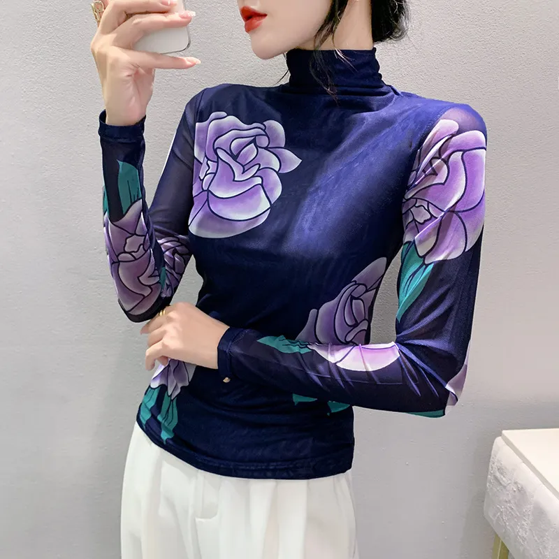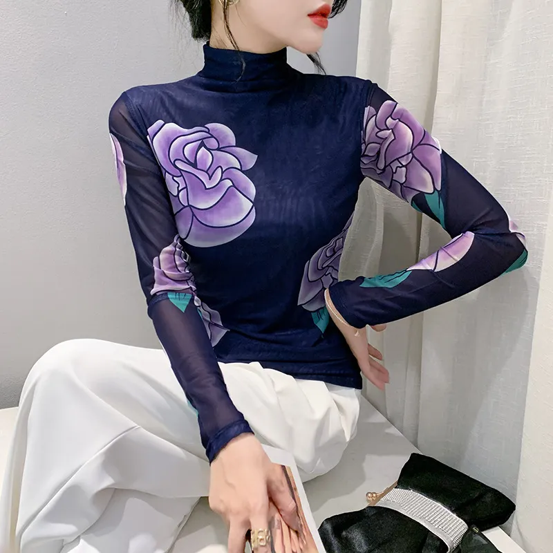 衣都精品- 2023新款紫色大花朵半高領高彈性上衣