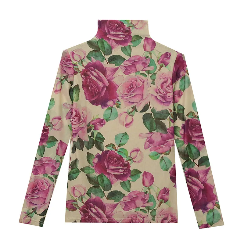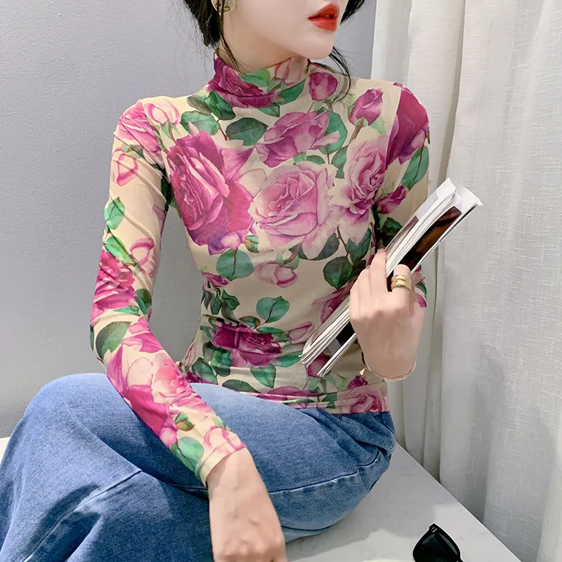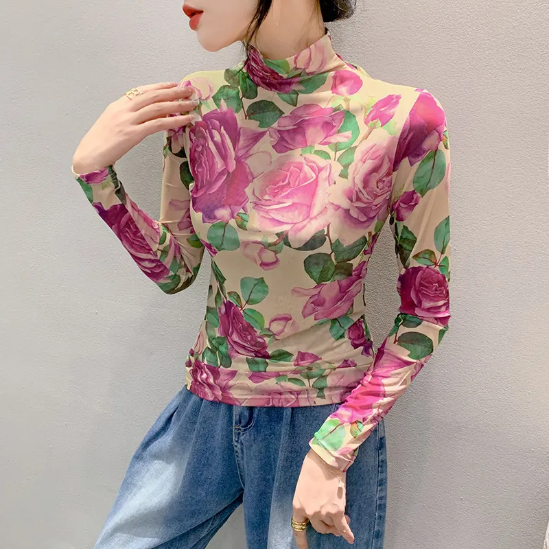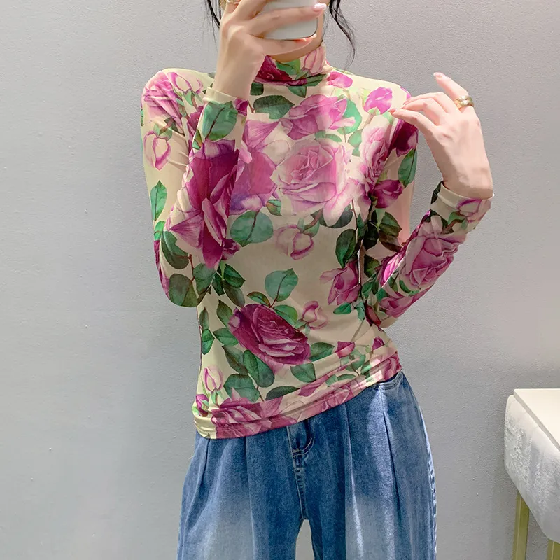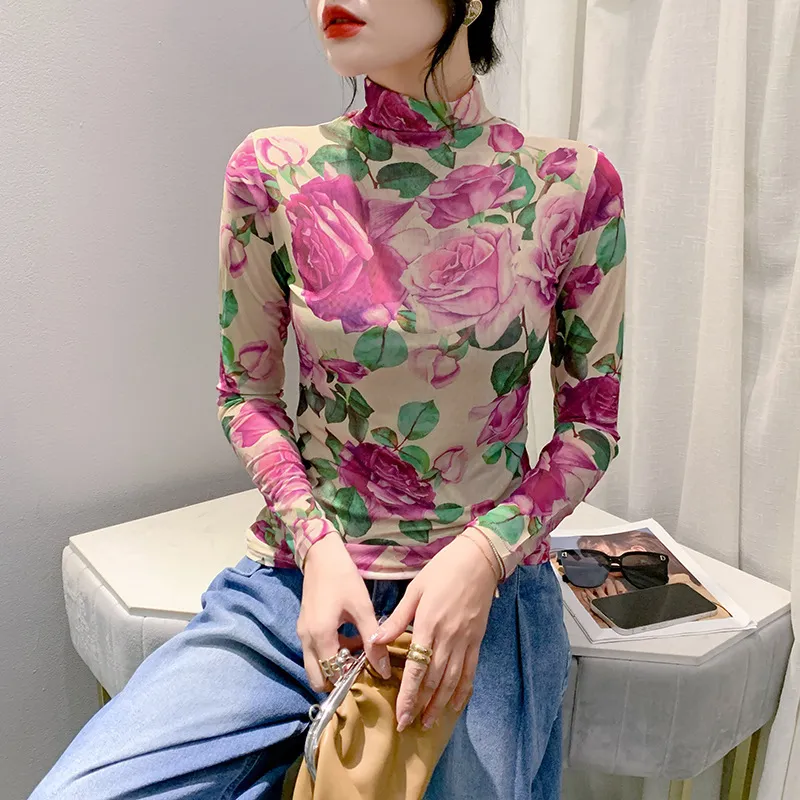衣都精品- 2023新款紫色大花朵半高領高彈性上衣