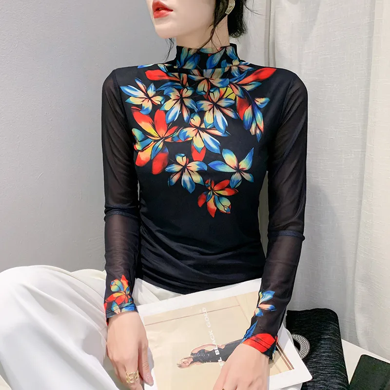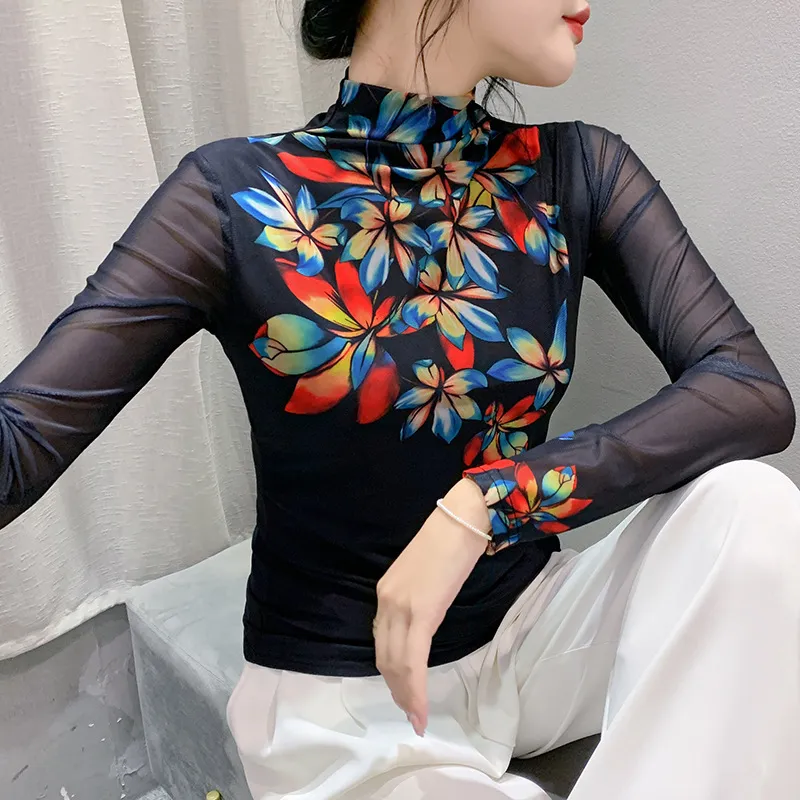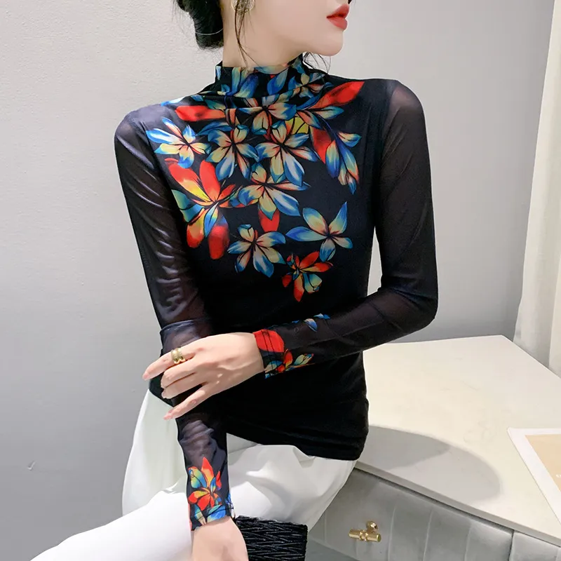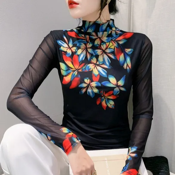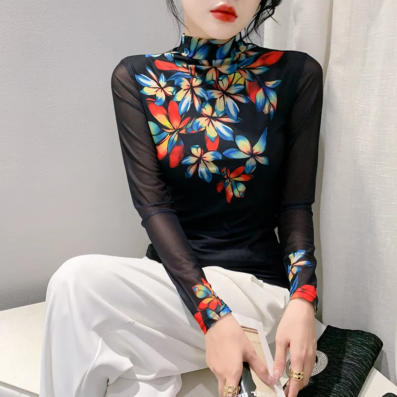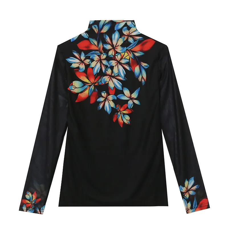 衣都精品- 2023新款歐風彩色花朵半高領打底小衫上衣