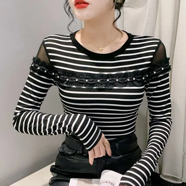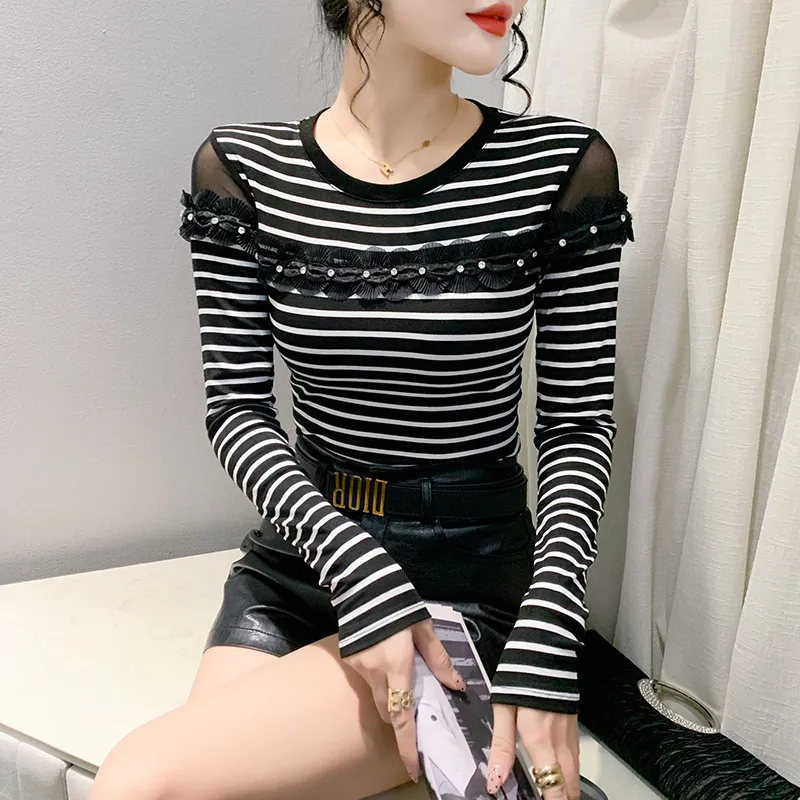 衣都精品- 2023新款海軍風黑白細橫條紋圓領上衣