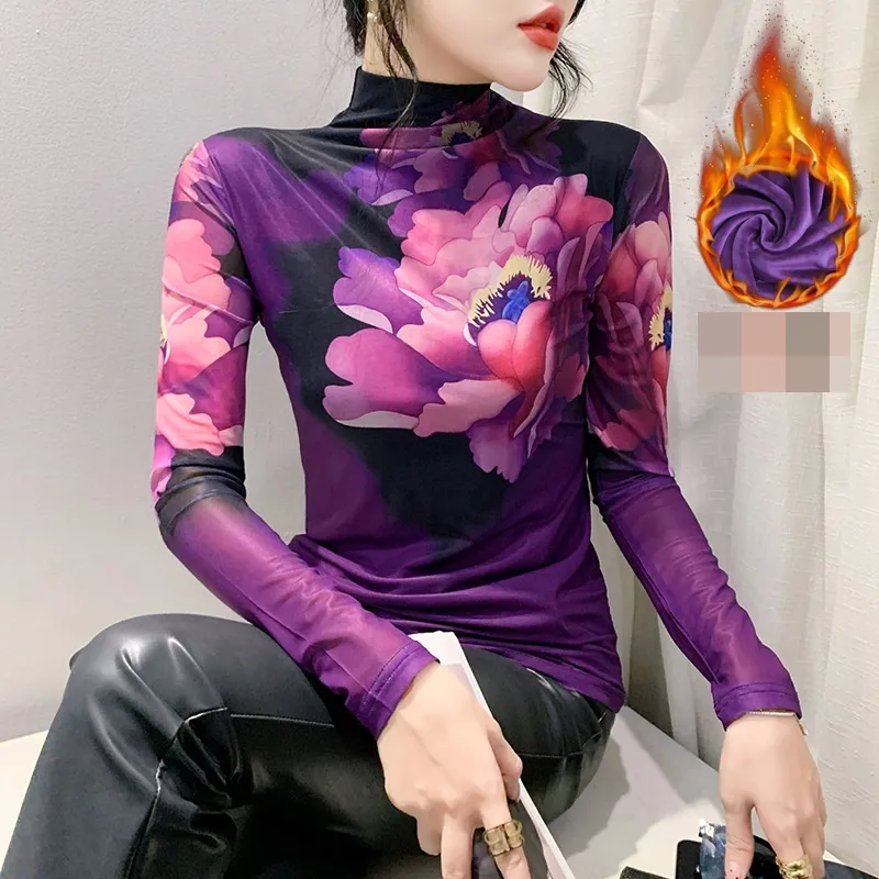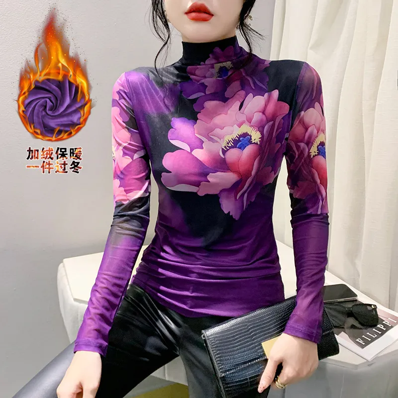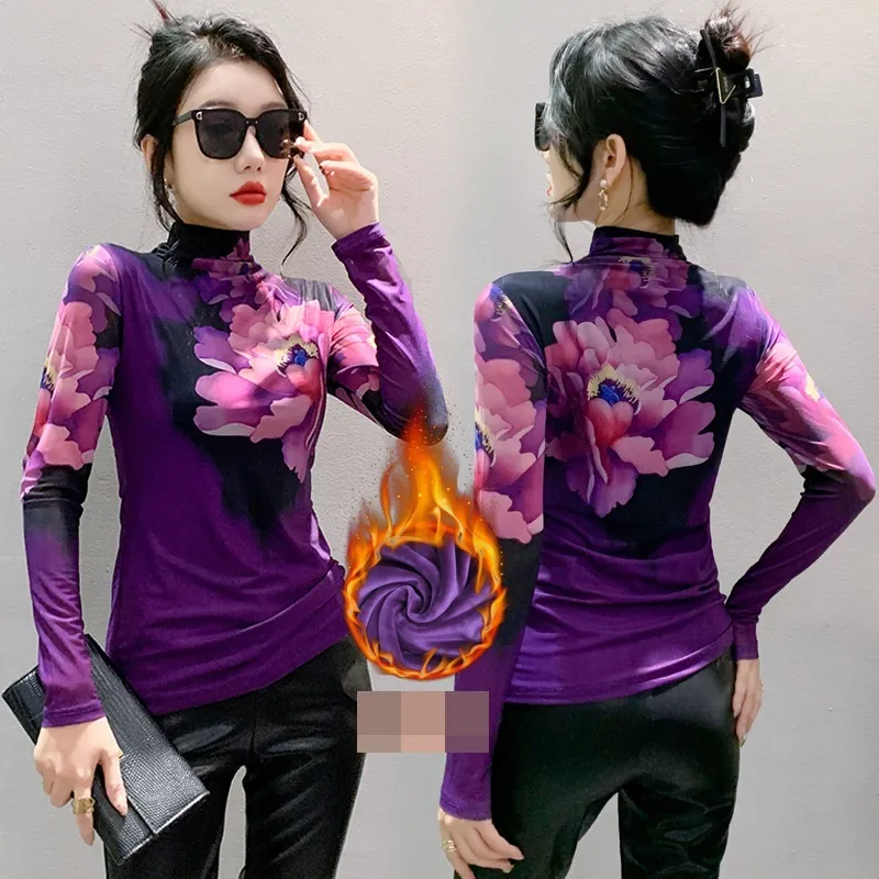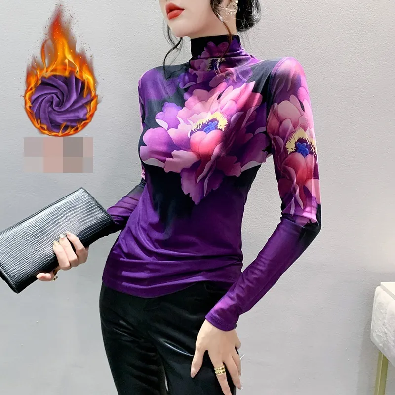 衣都精品- 2023新款加絨加厚紫色碎花打底上衣