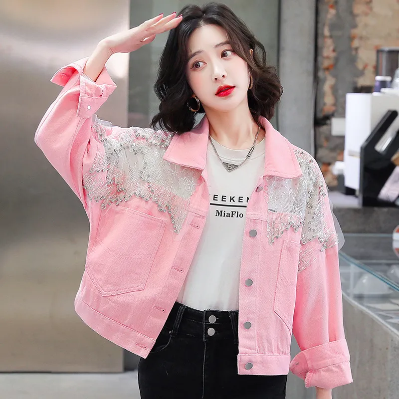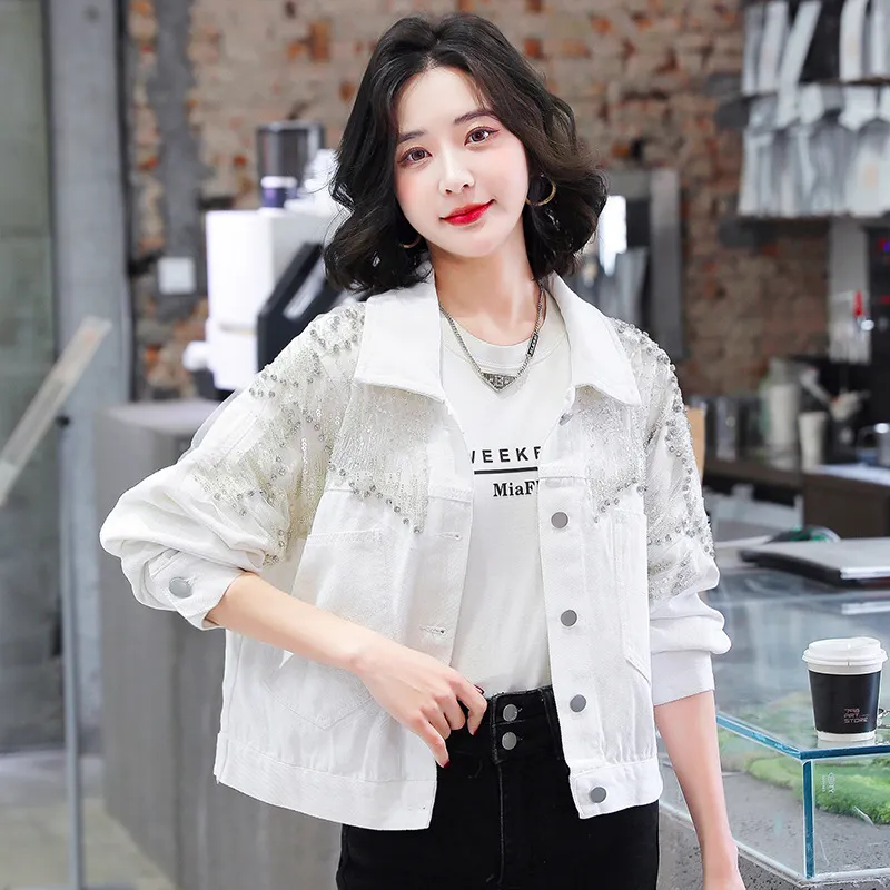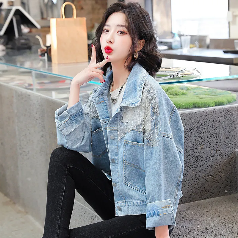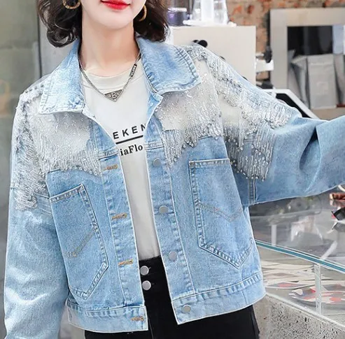 衣都精品- 2023新款重工流蘇亮片網紗拼接牛仔外套