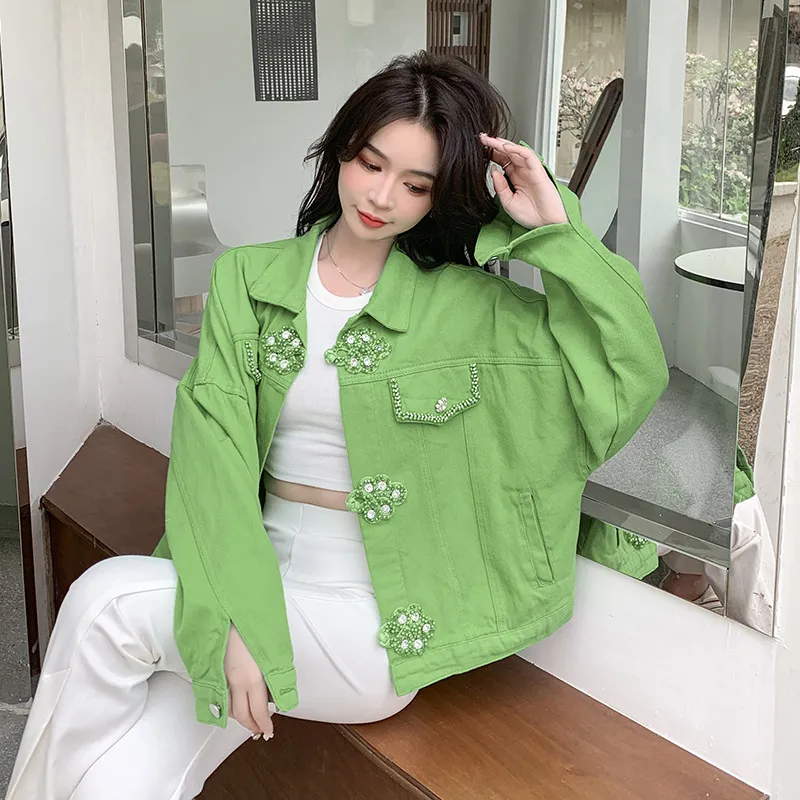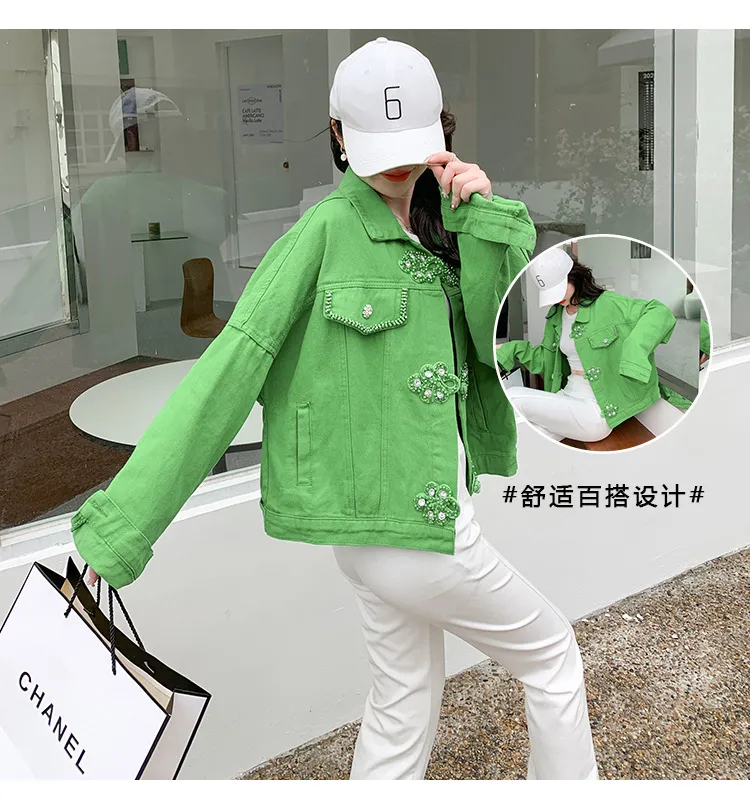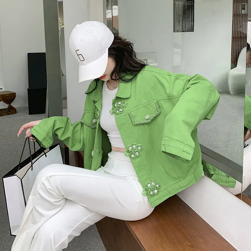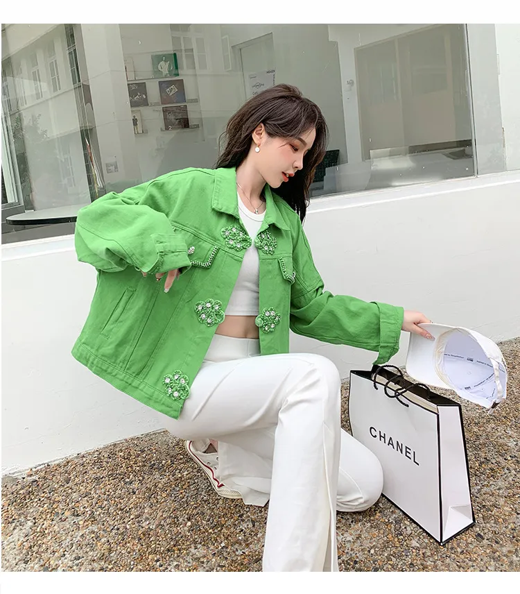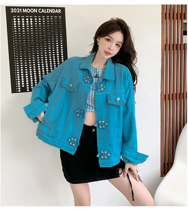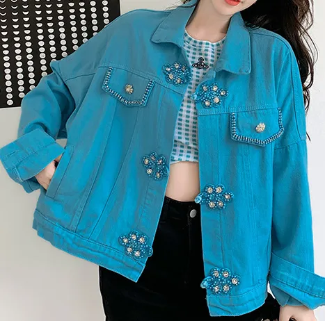 衣都精品- 2023新款歐風釘珠燙鑽花朵牛仔外套