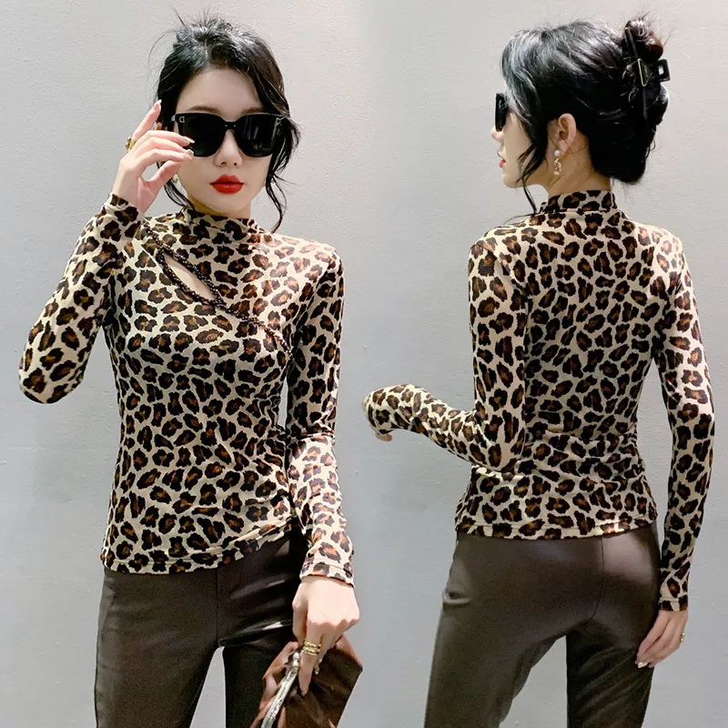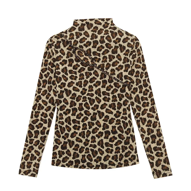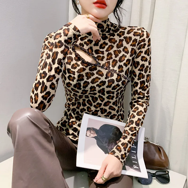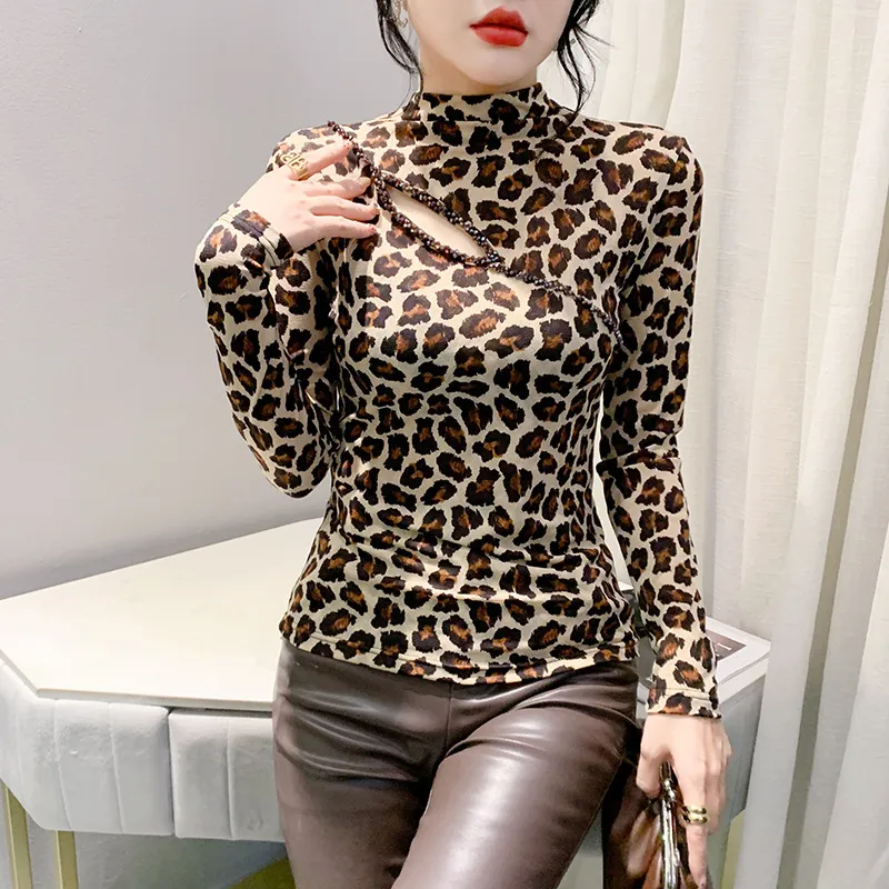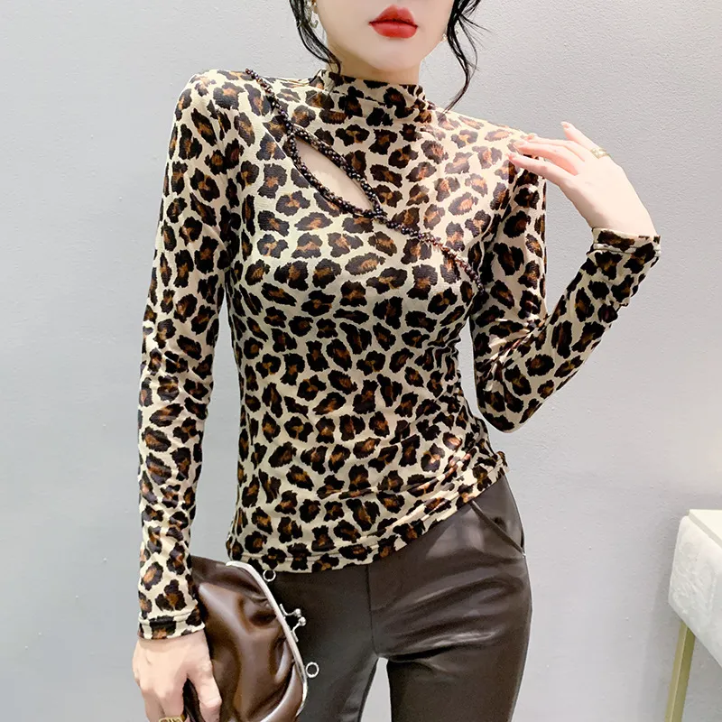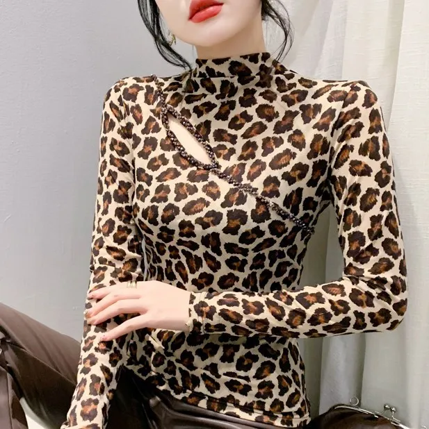 衣都精品- 2023新款歐美豹紋鏤空串珠大碼上衣
