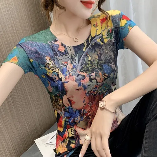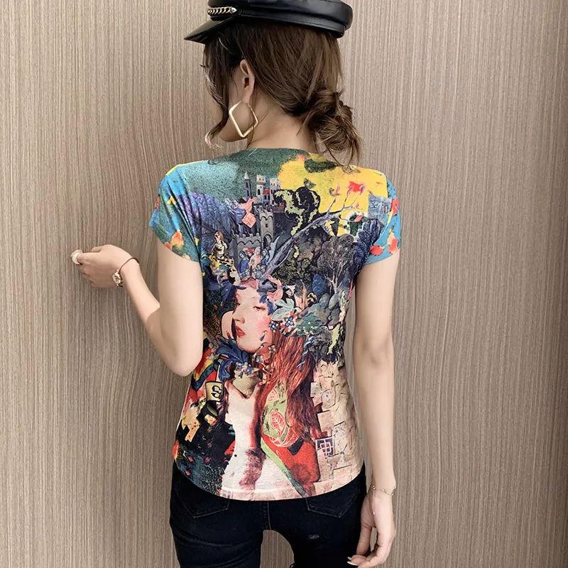 衣都精品- 新款歐風復古油畫美女印花短袖上衣