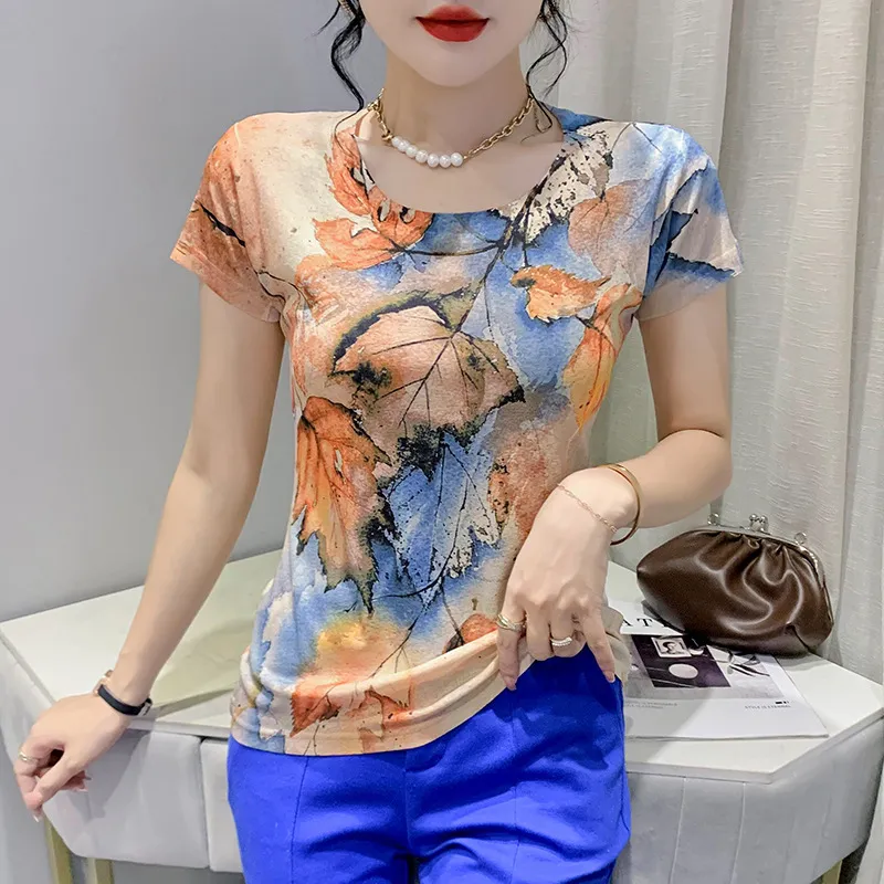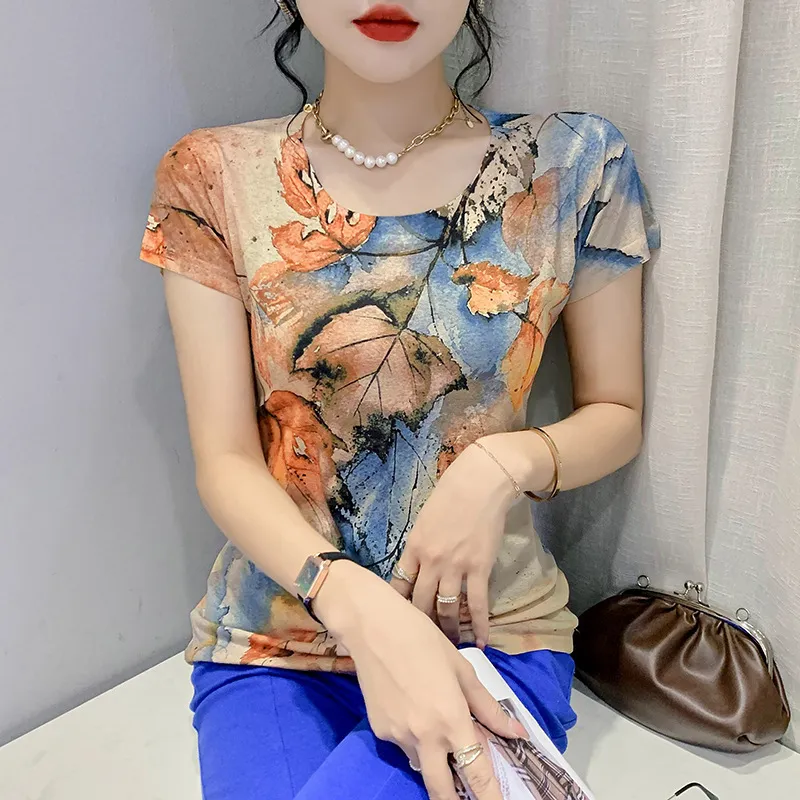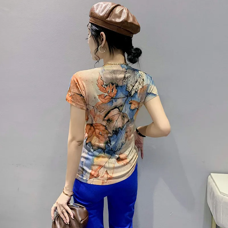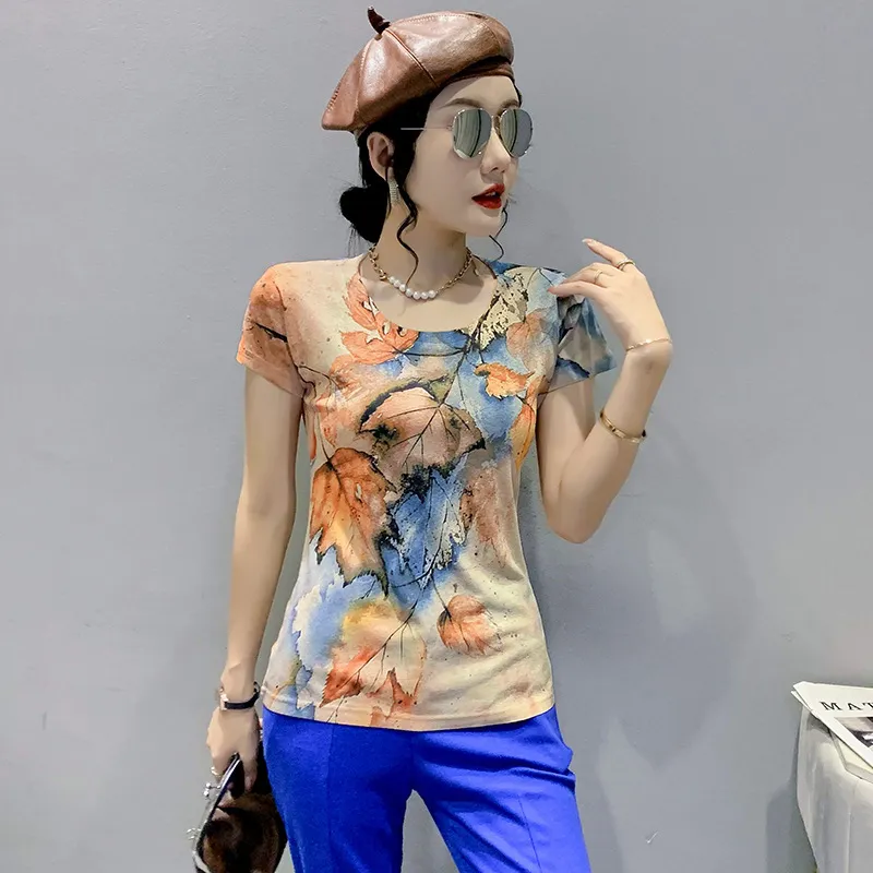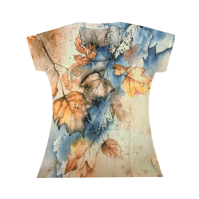 衣都精品- 新款歐風楓葉印花圓領套頭短袖上衣