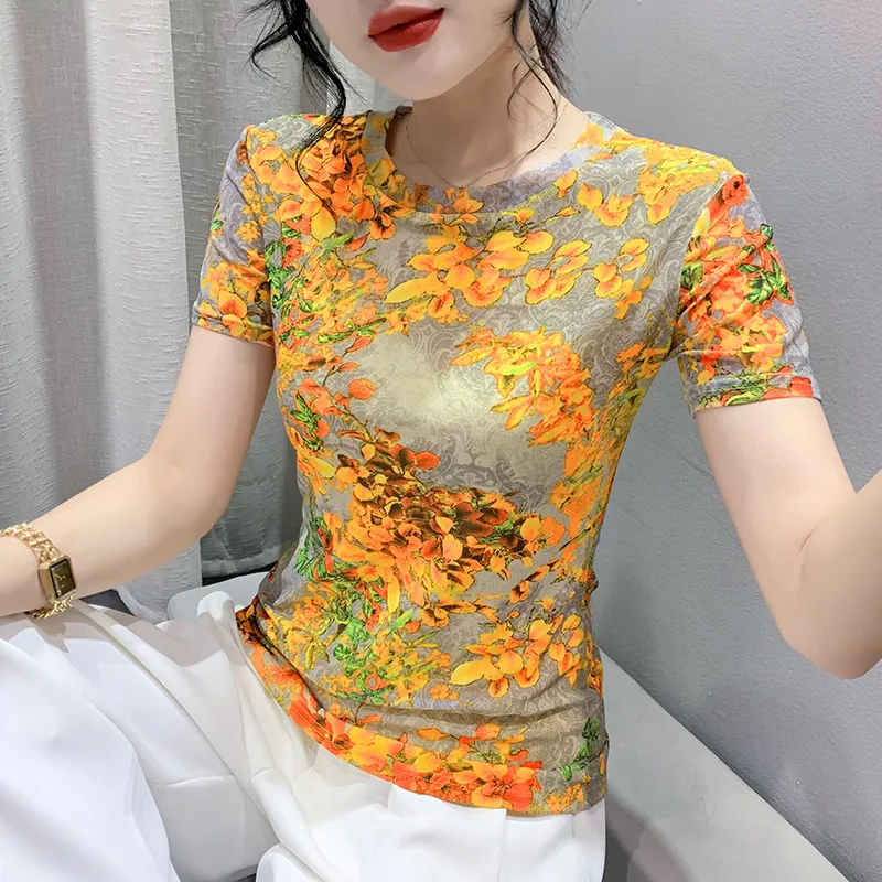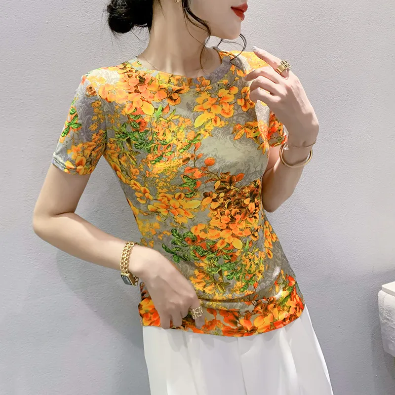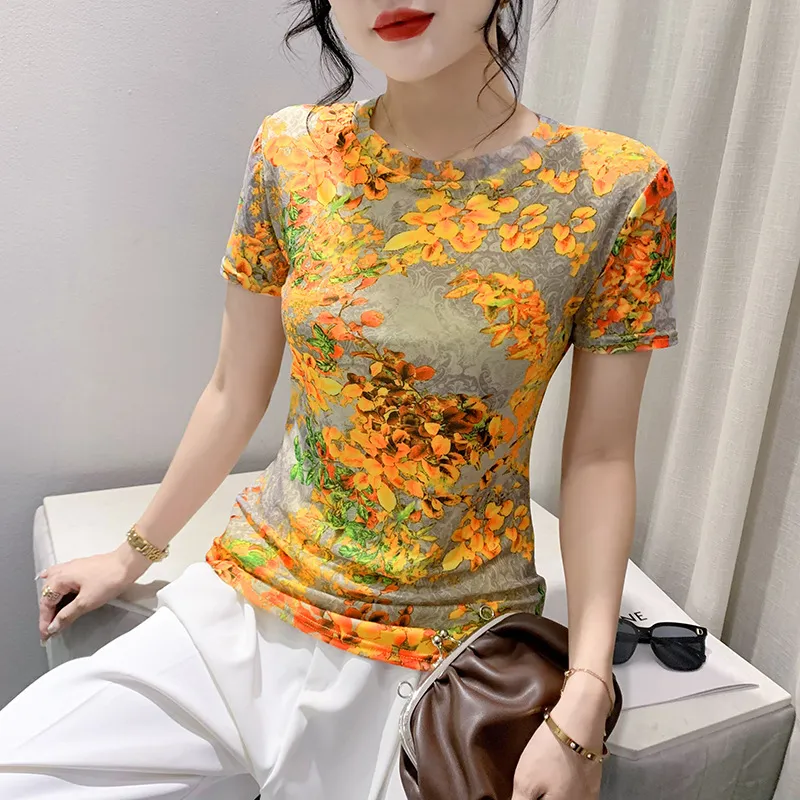 衣都精品- 新款網紗短袖花草印花套頭綠色上衣