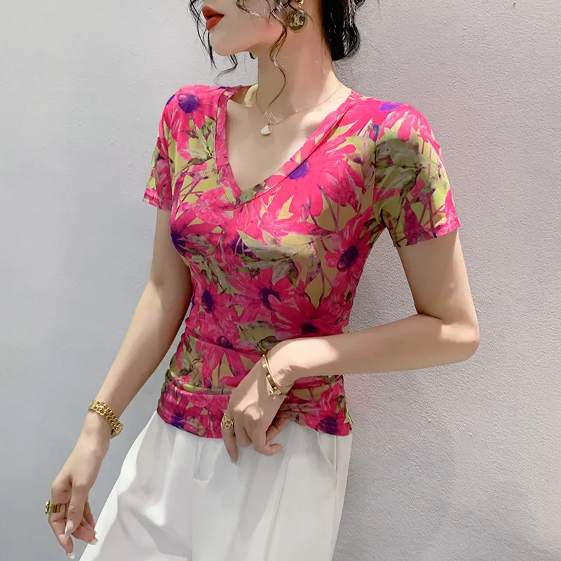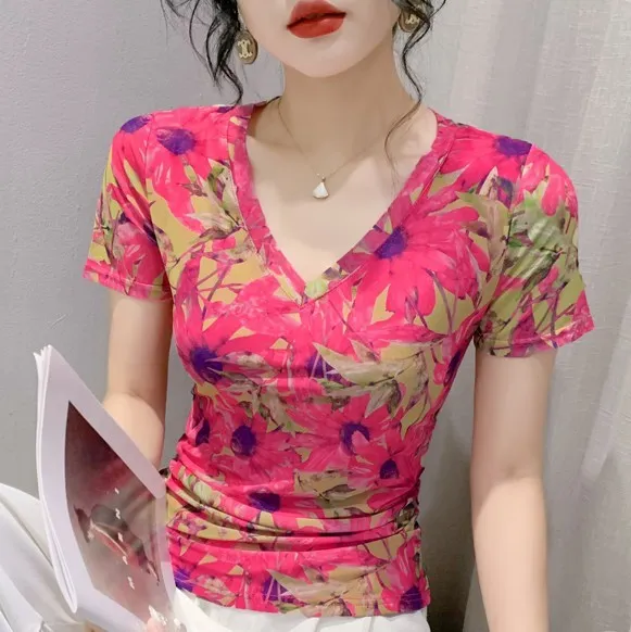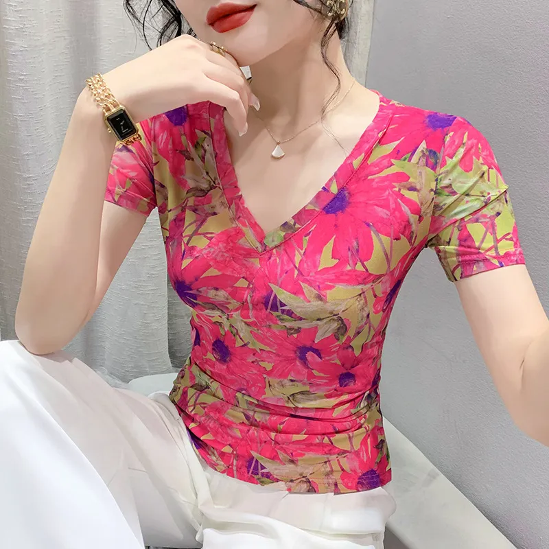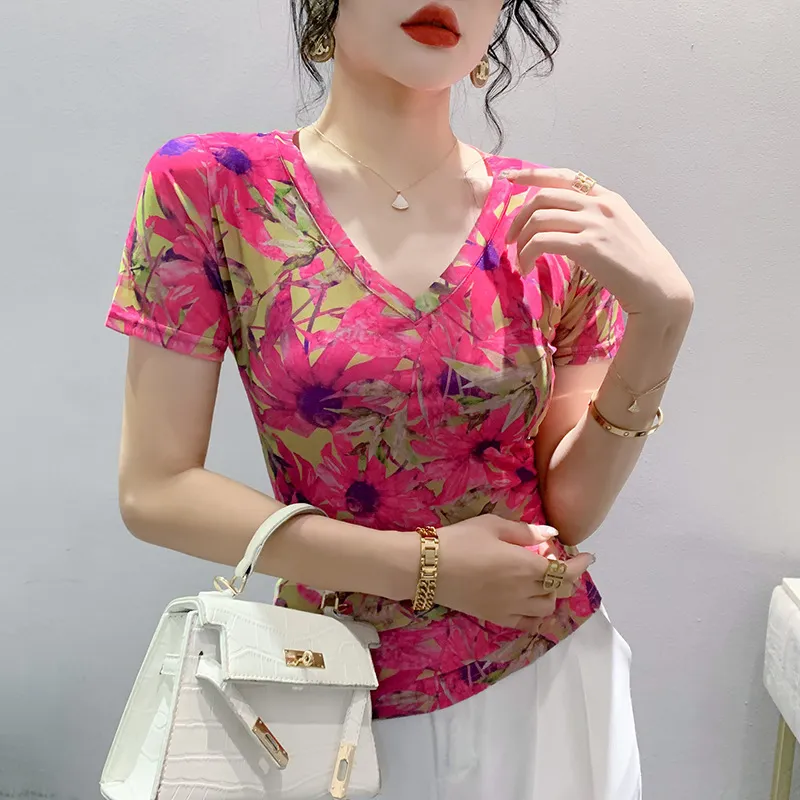 衣都精品- 新款網紗短袖花草印花套頭綠色上衣