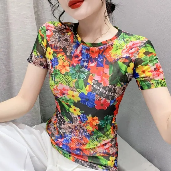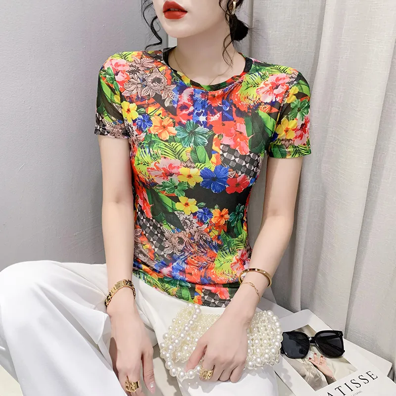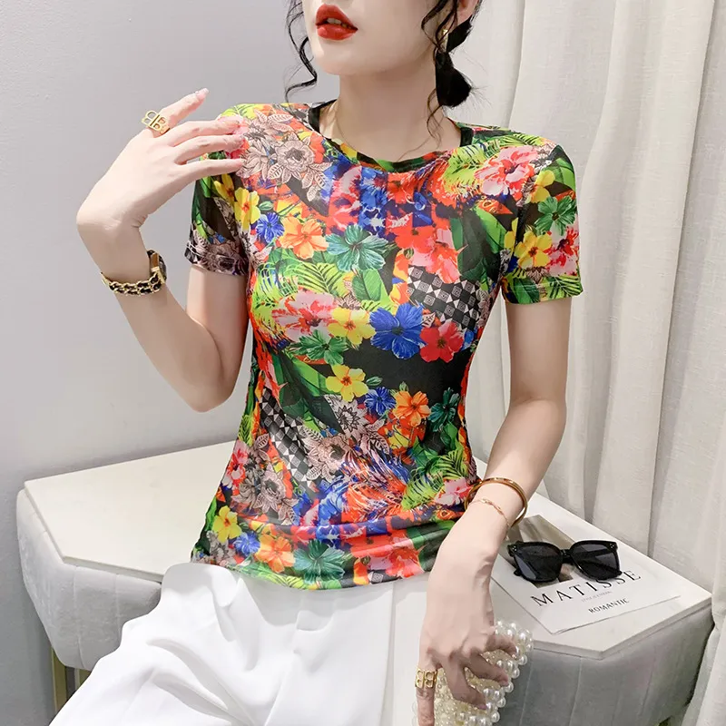 衣都精品- 新款網紗短袖花草印花套頭綠色上衣