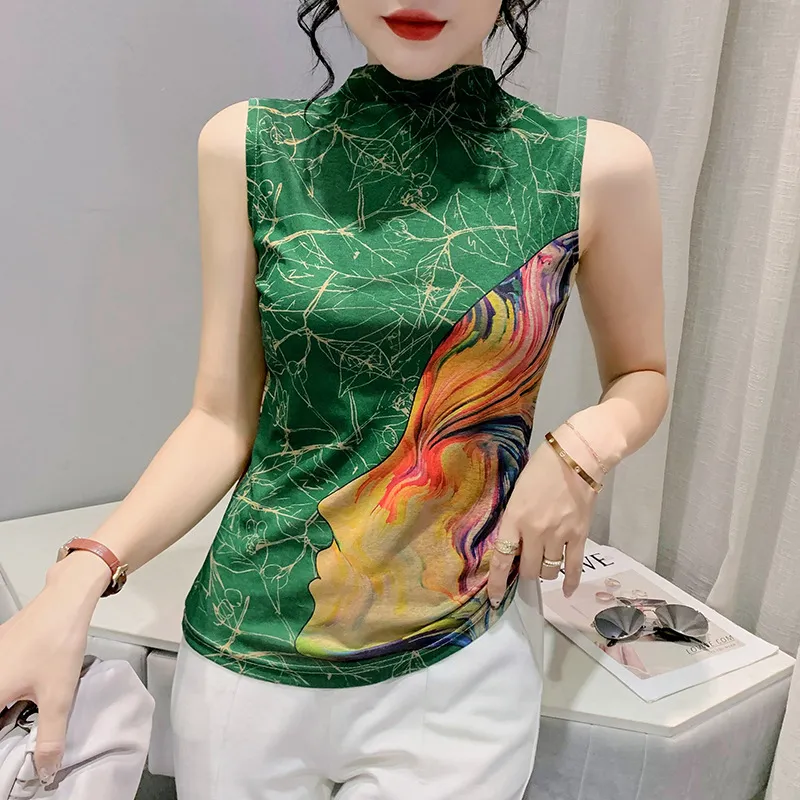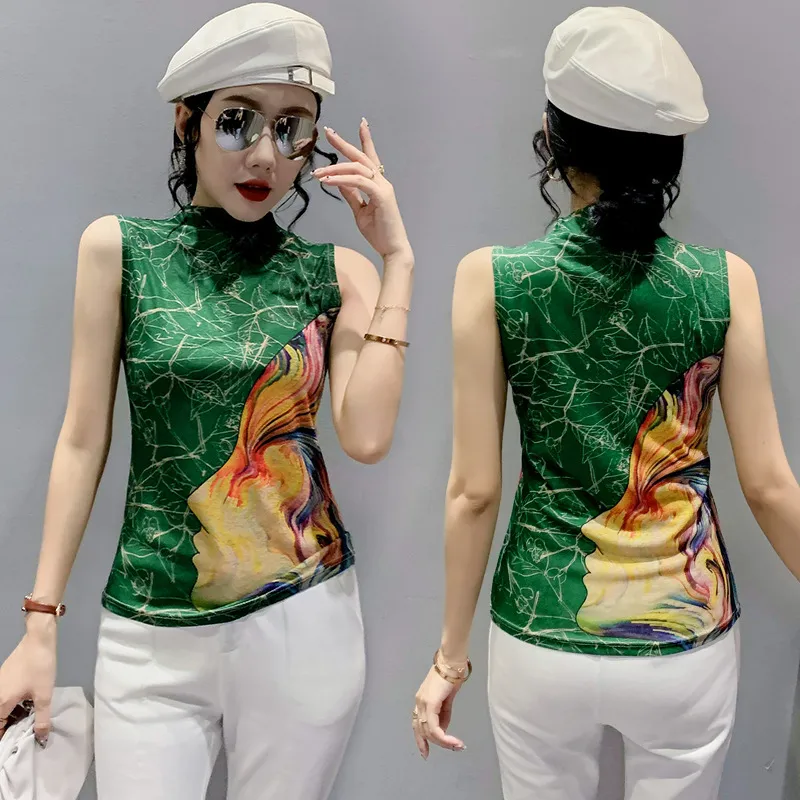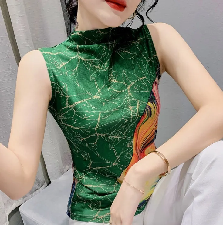 衣都精品- 新款暈染抽像印花無袖高領小背心上衣