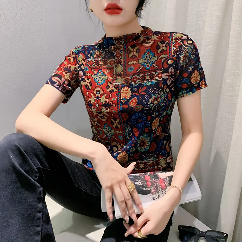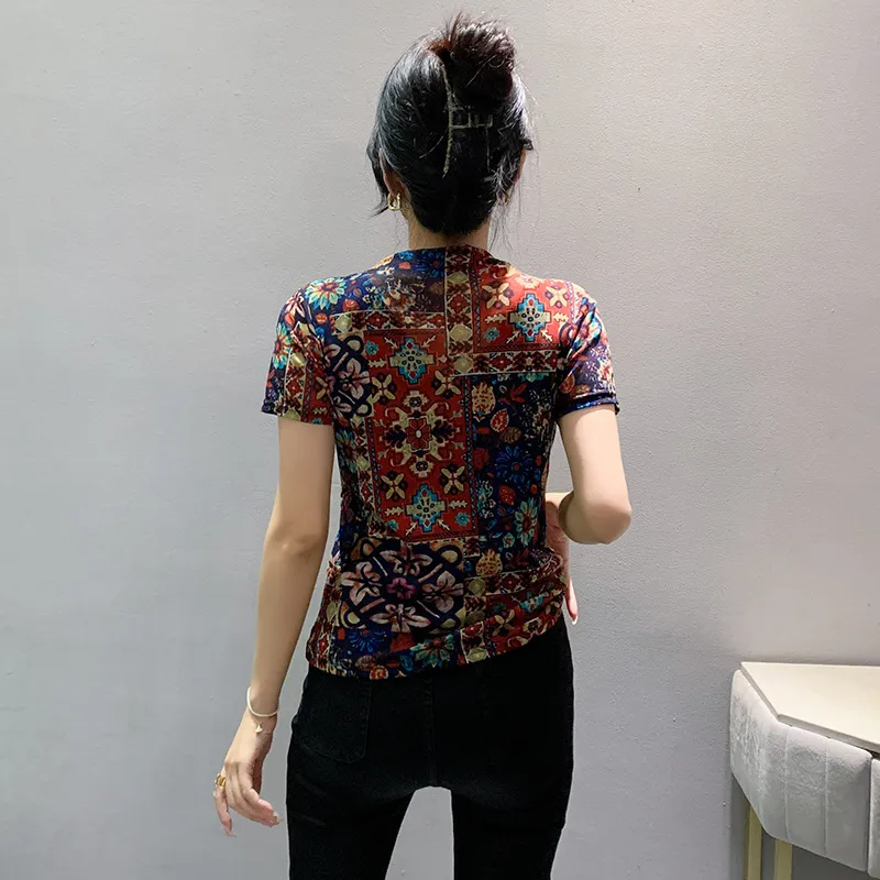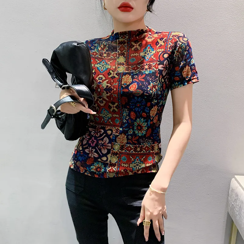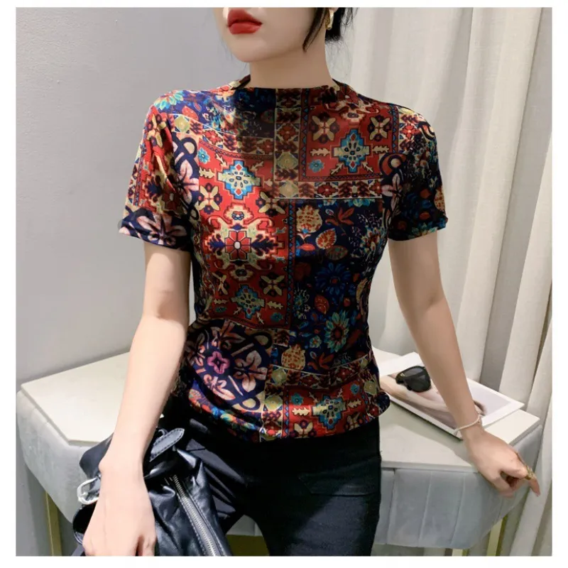衣都精品- 新款碎花鮮豔田園風半袖女神油畫上衣
