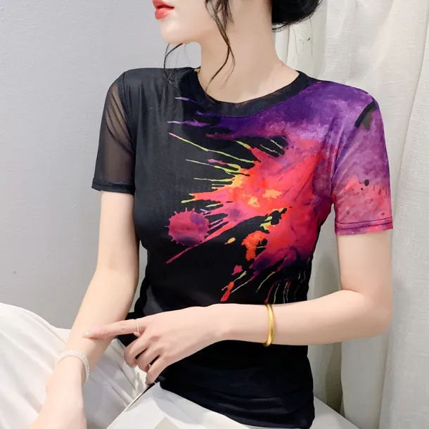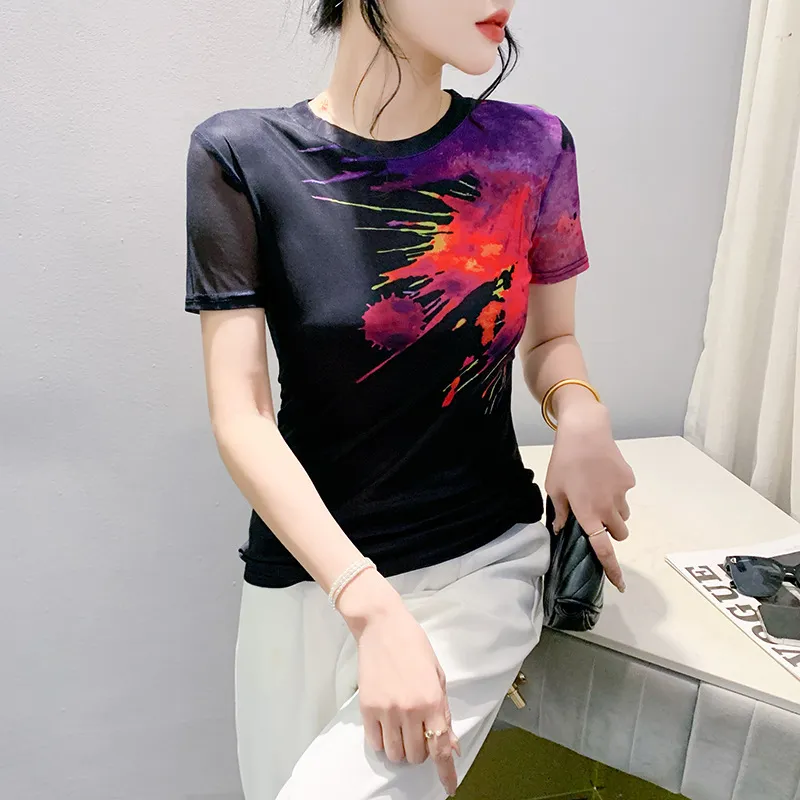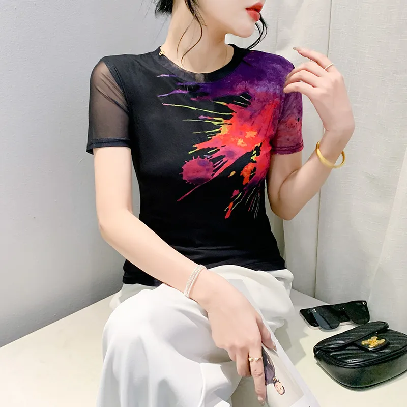 衣都精品- 新款網紗暈染撞色塗鴉短袖上衣