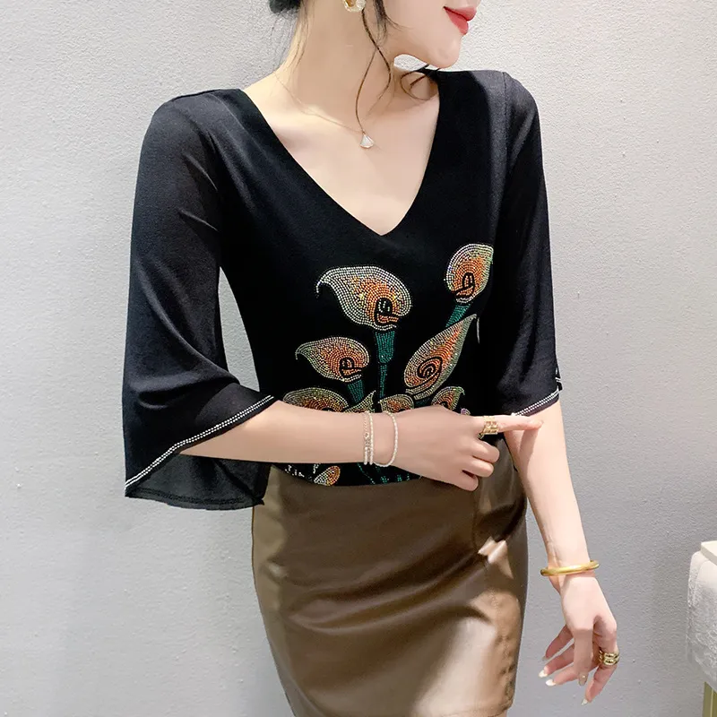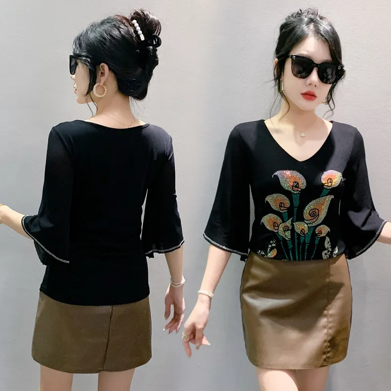 衣都精品- 新款歐版水仙花燙鑽喇叭中袖上衣