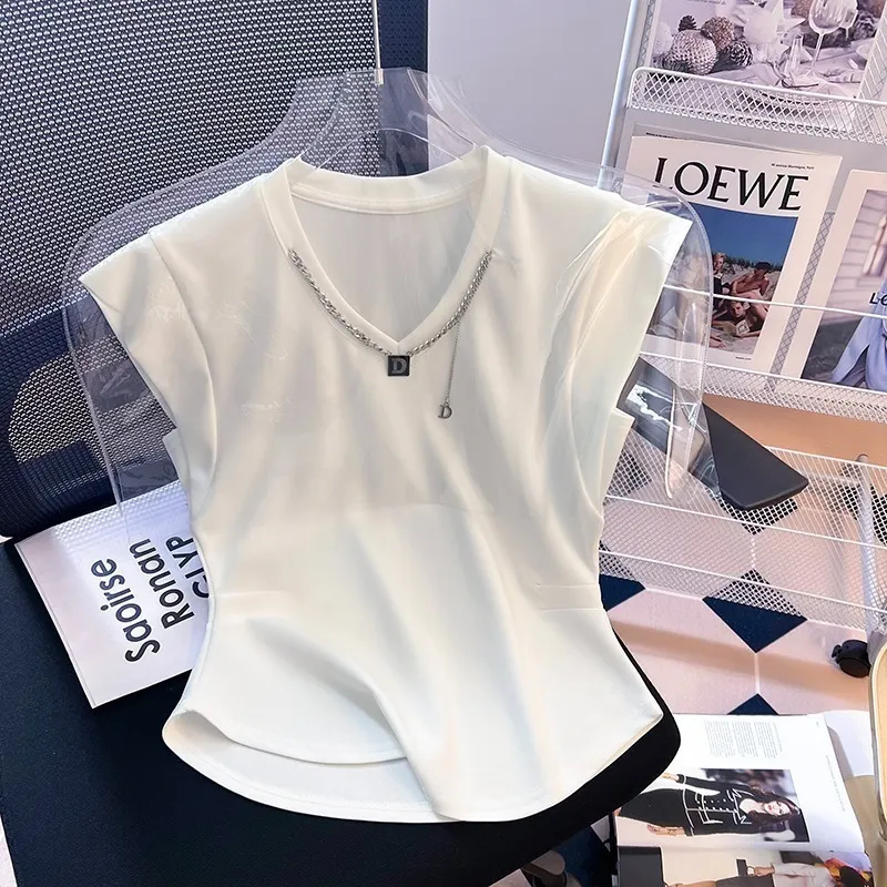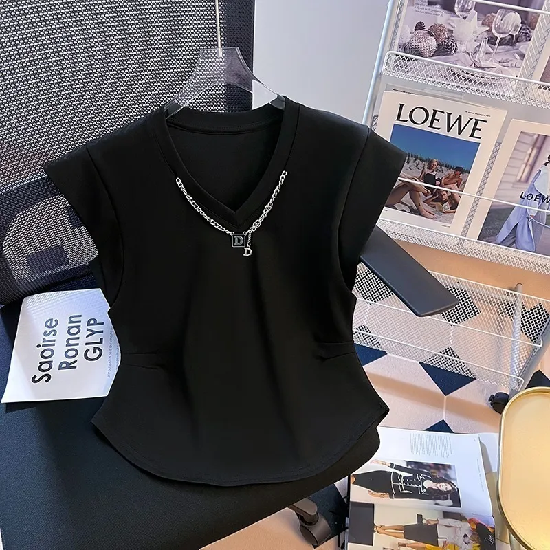 衣都精品- 新款V領鏈條不規則飛飛袖短款上衣
