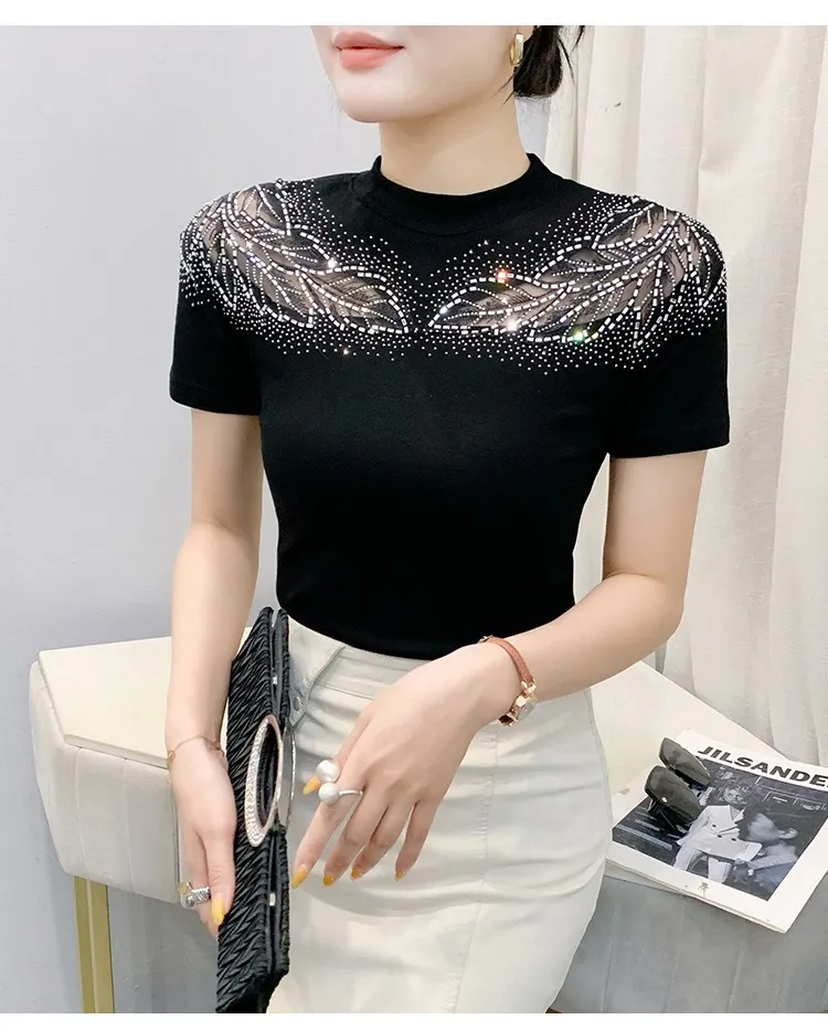 衣都精品- 新款百搭美式大碼黏鑽鏤空上衣