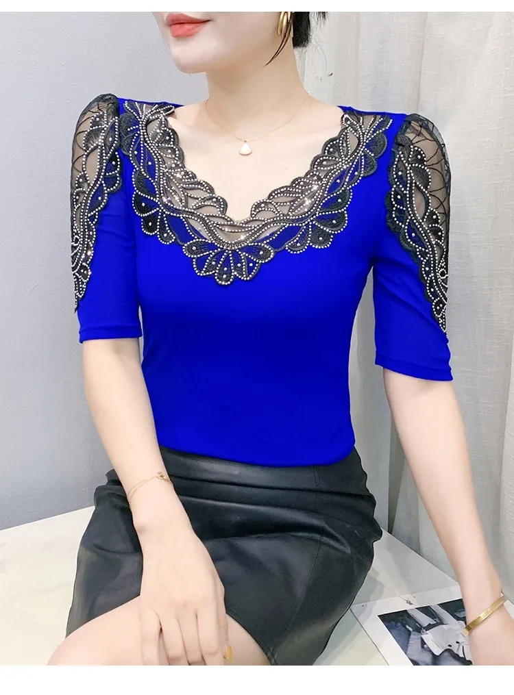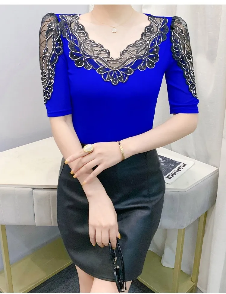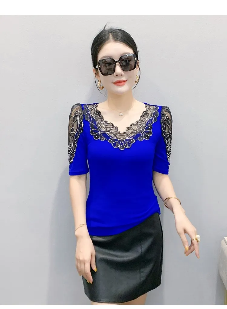 衣都精品- 新款百搭美式大碼黏鑽鏤空上衣
