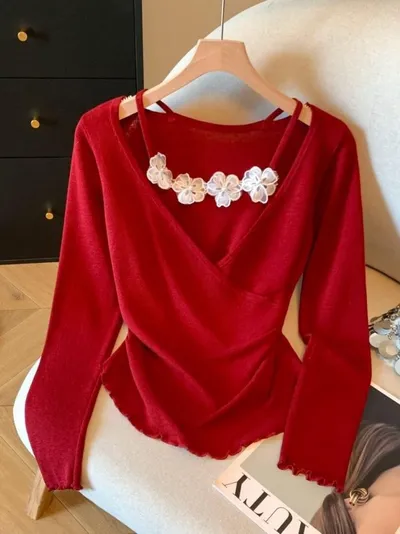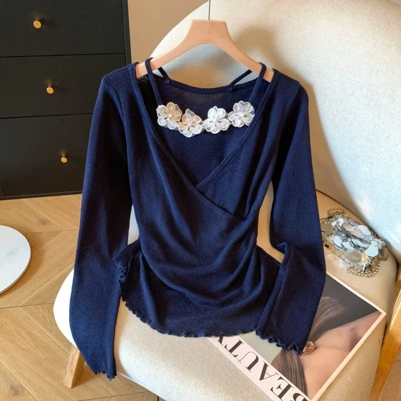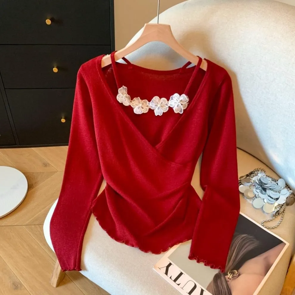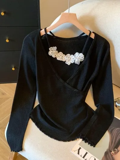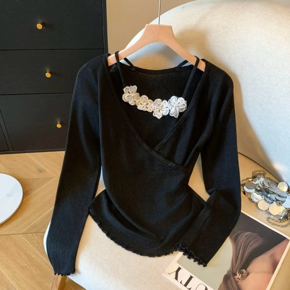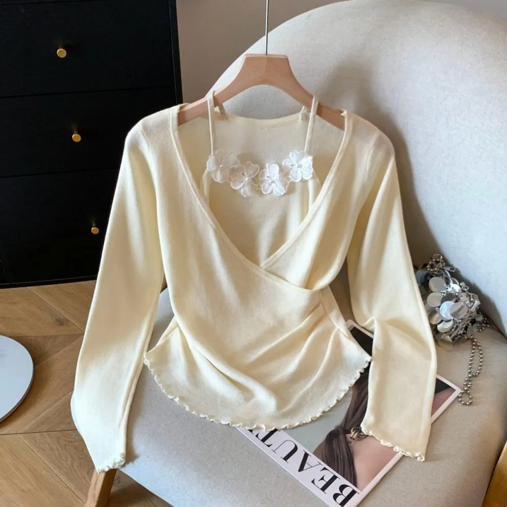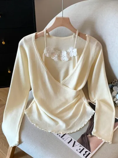 衣都精品- 新款立體小花朵吊帶假兩件針織衫上衣