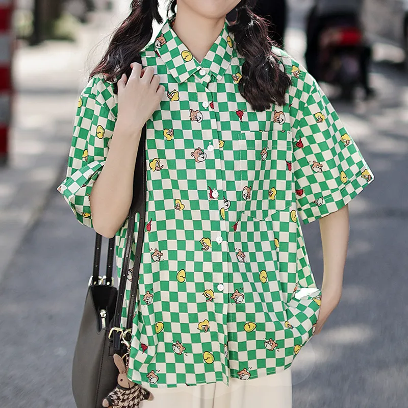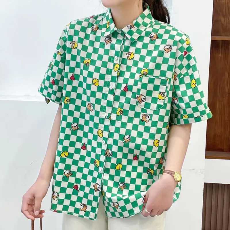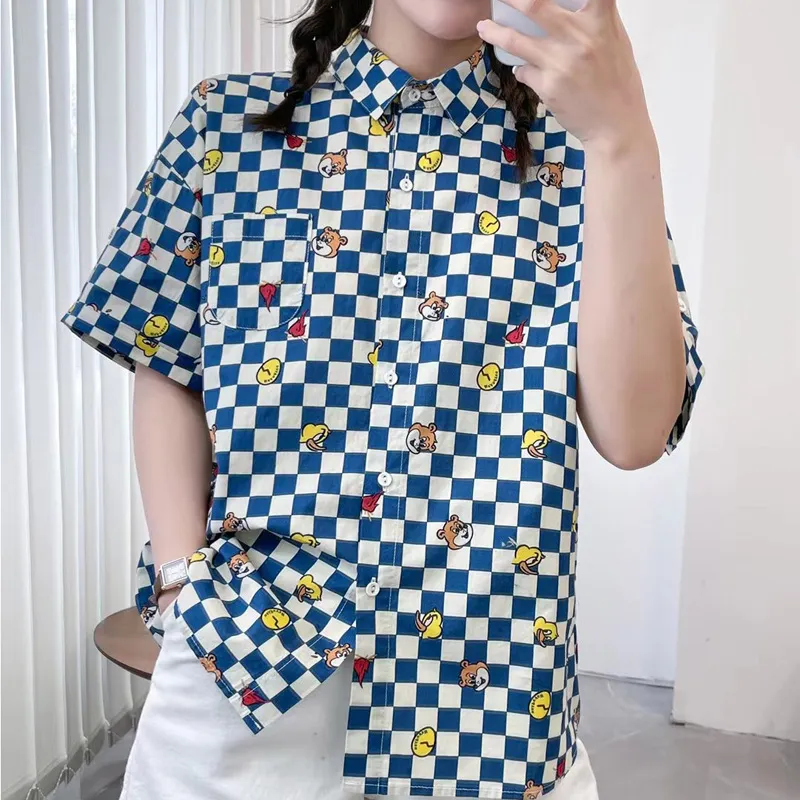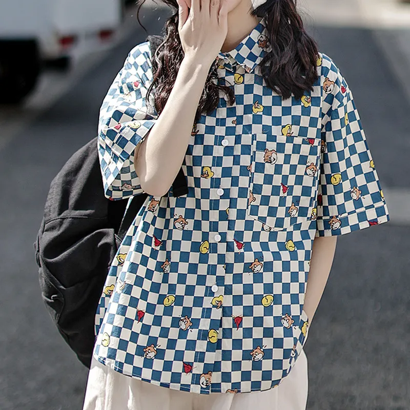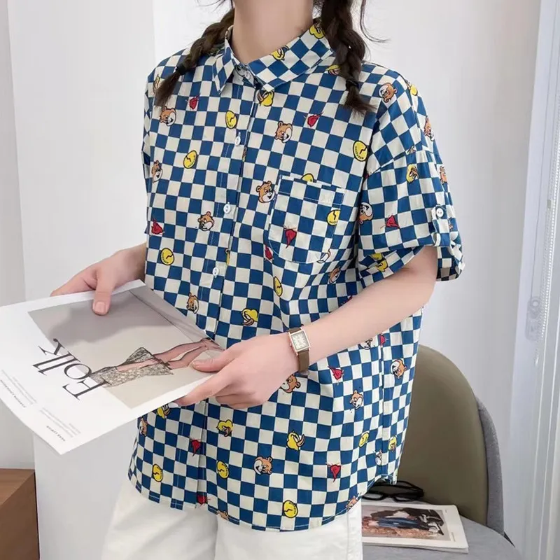 衣都精品- 2023新款棋盤格卡通印花短袖上衣