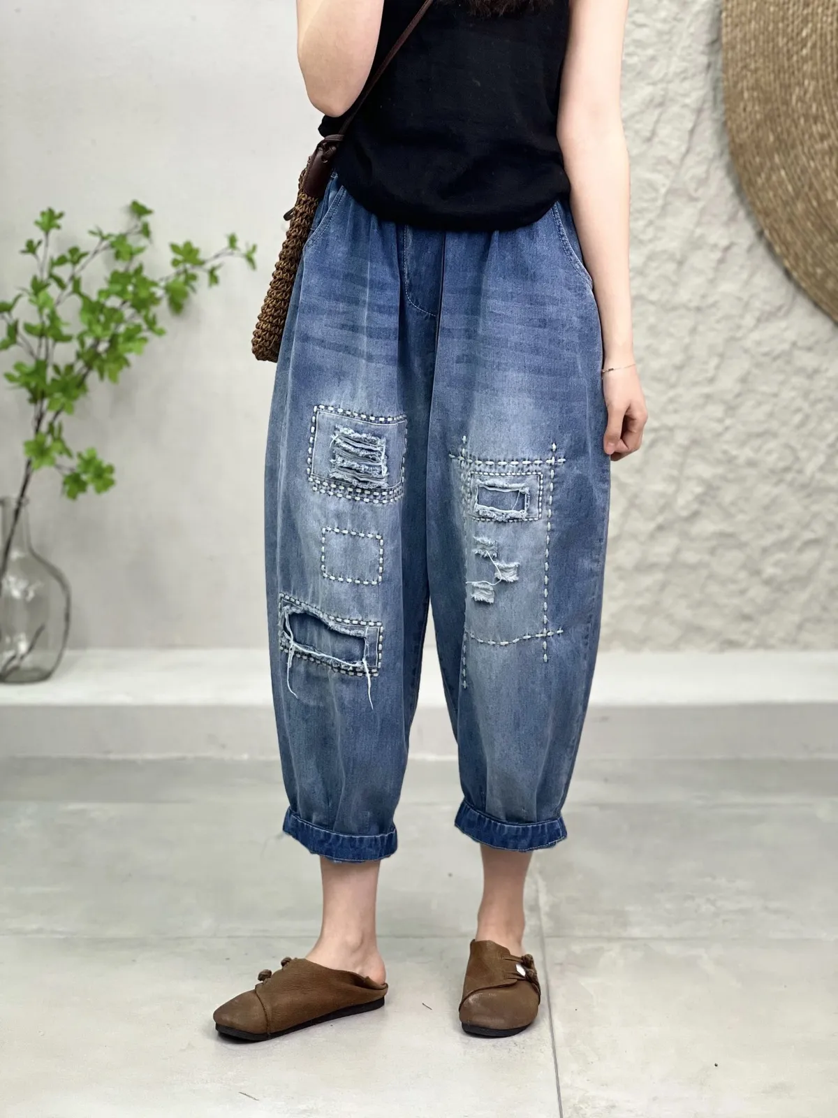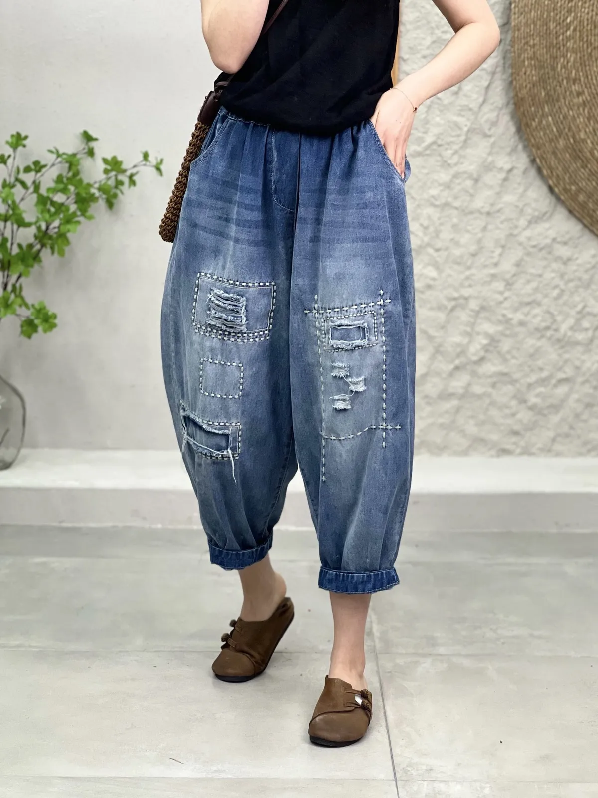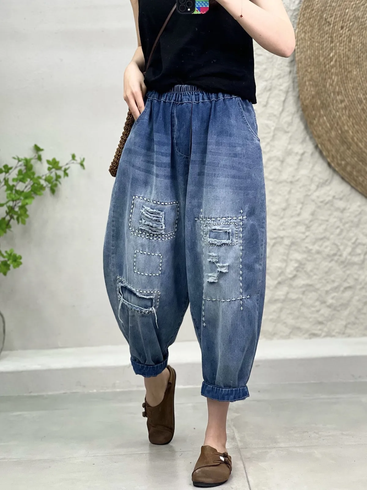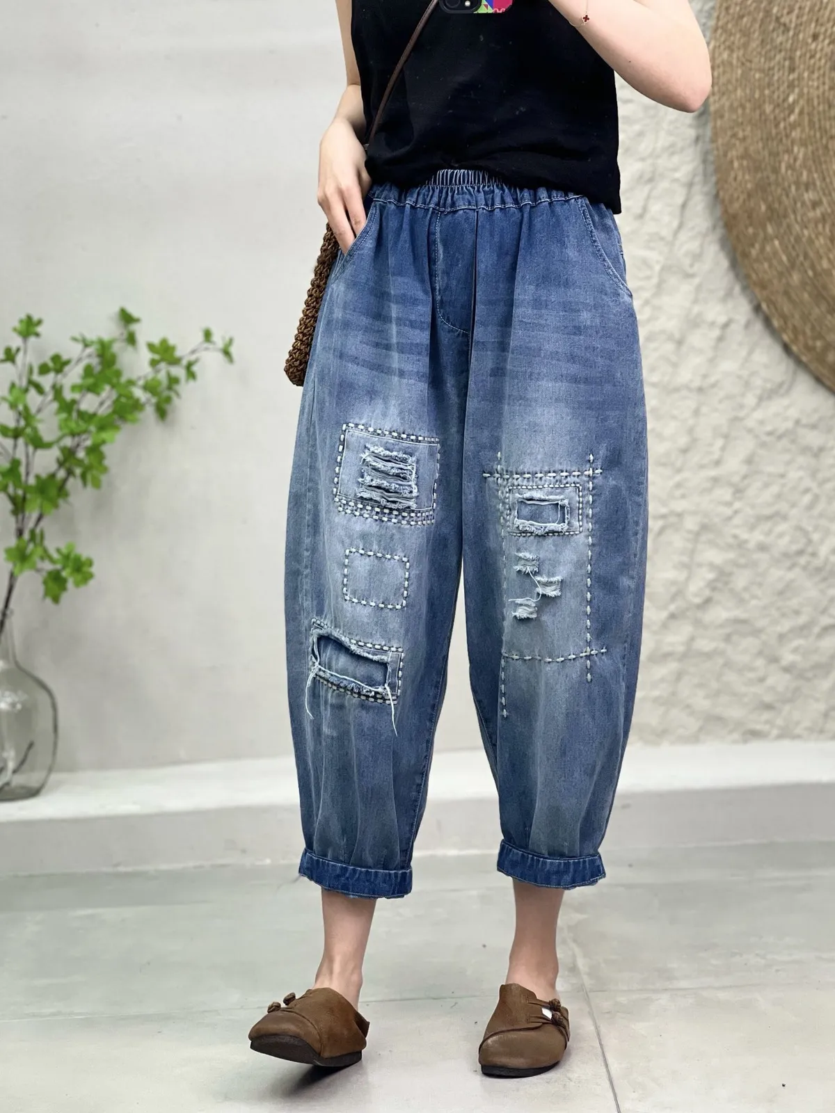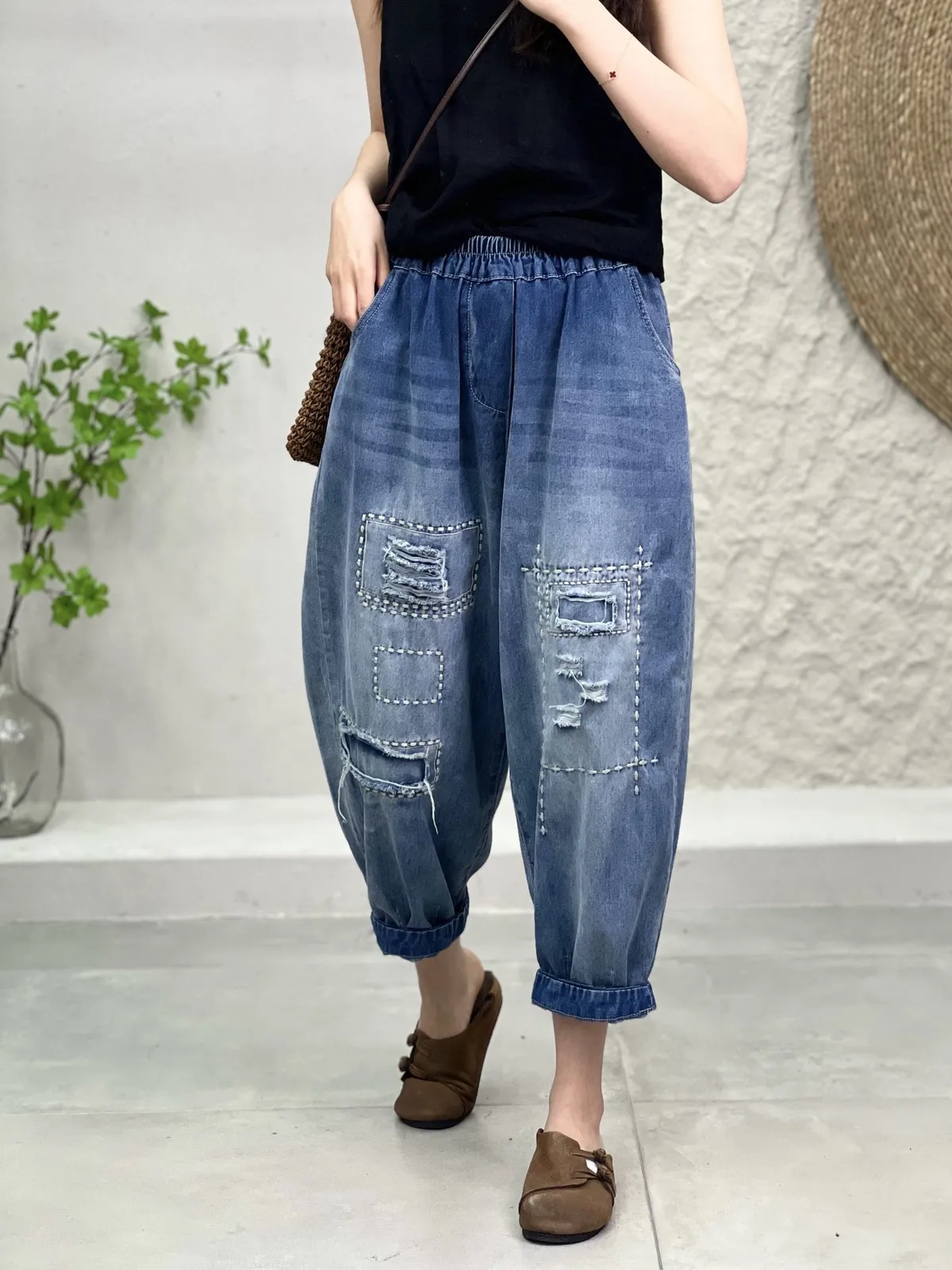 衣都精品- 2023新款復古民族風簡約破洞鬆緊腰休閒褲