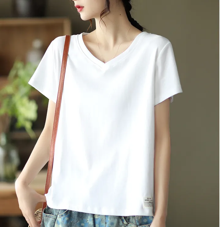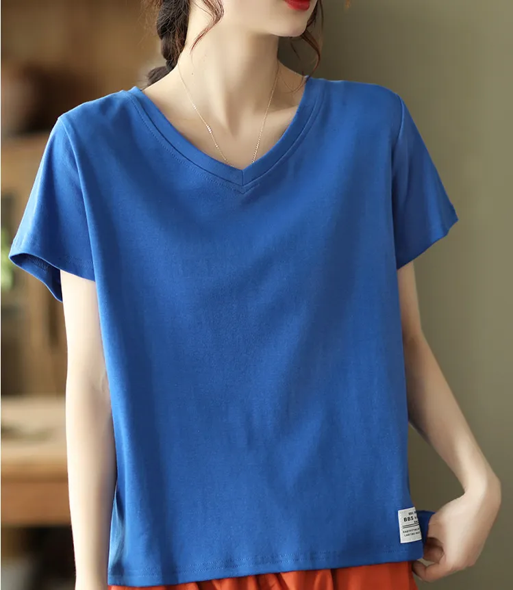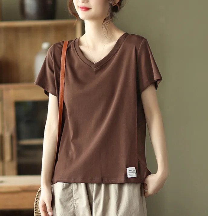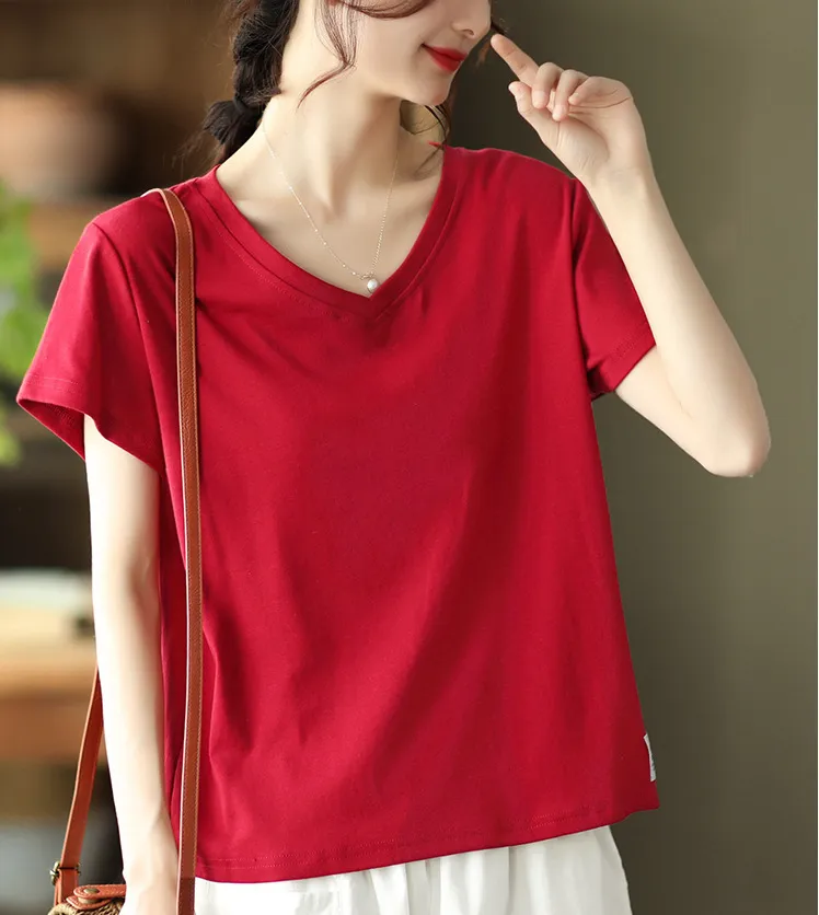 衣都精品- 2023新款文藝純色V領寬鬆短袖上衣