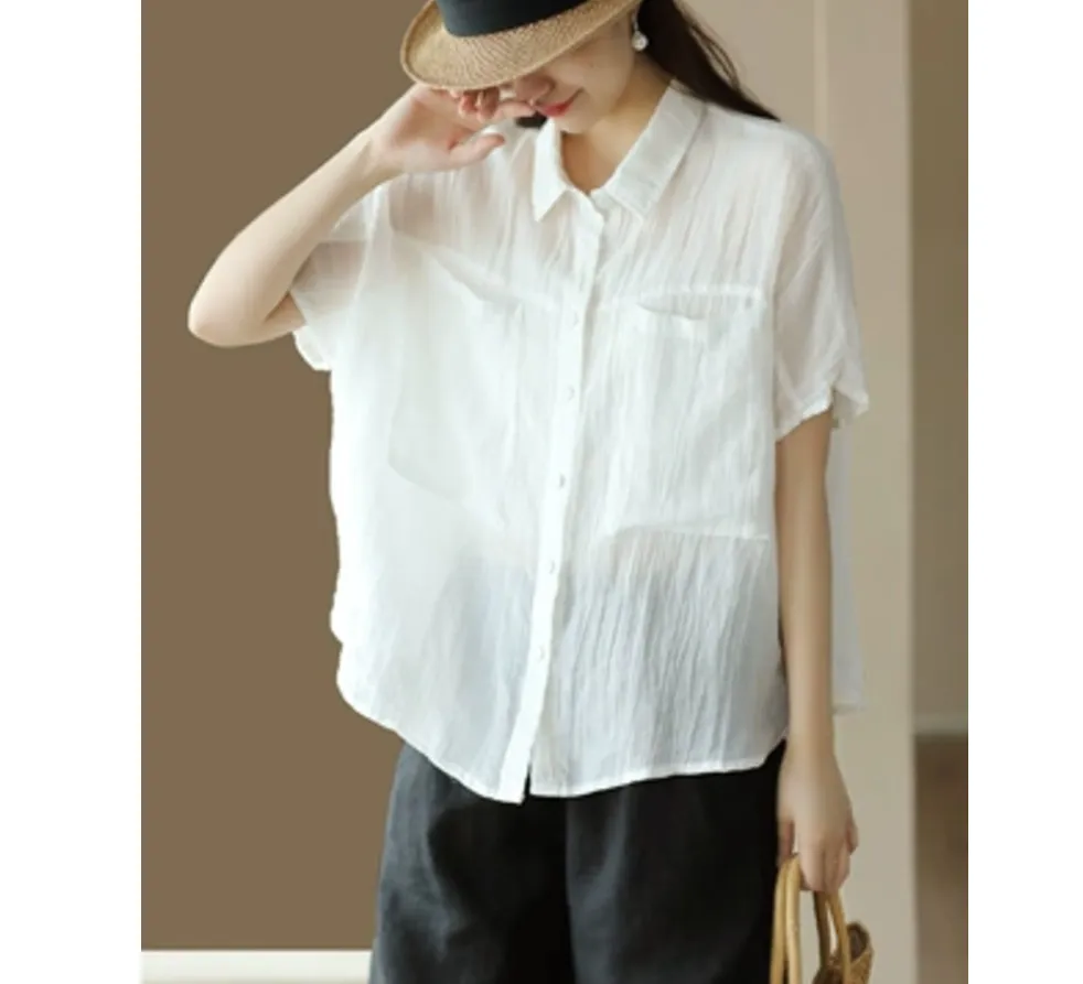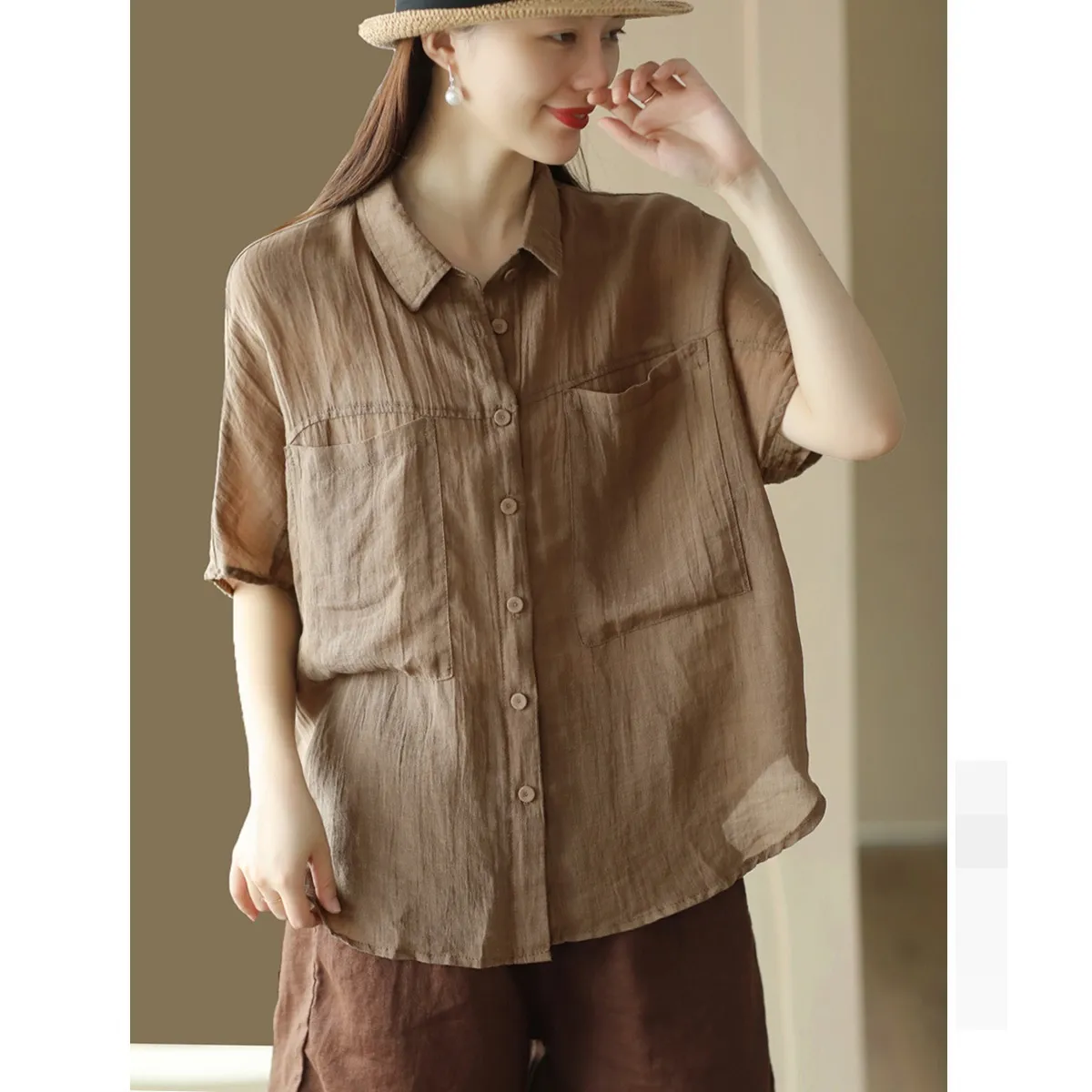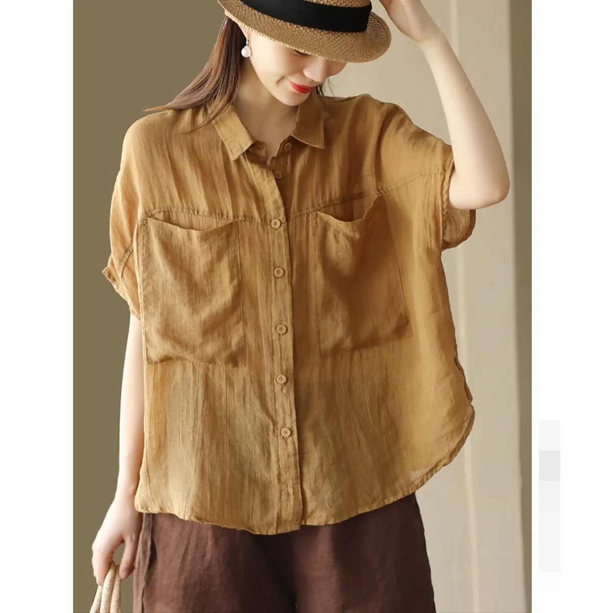 衣都精品- 2023新款復古寬鬆氣質翻領短袖上衣