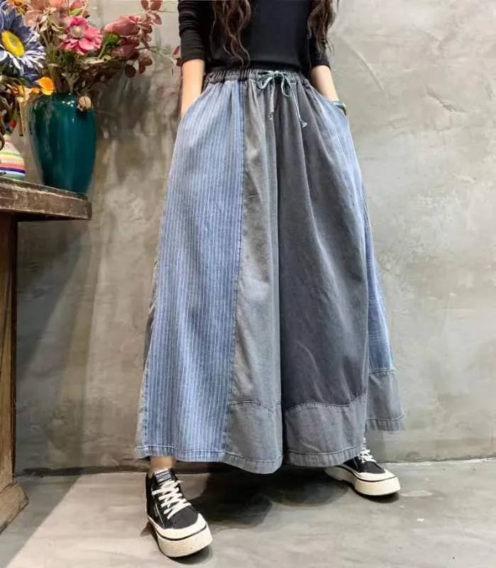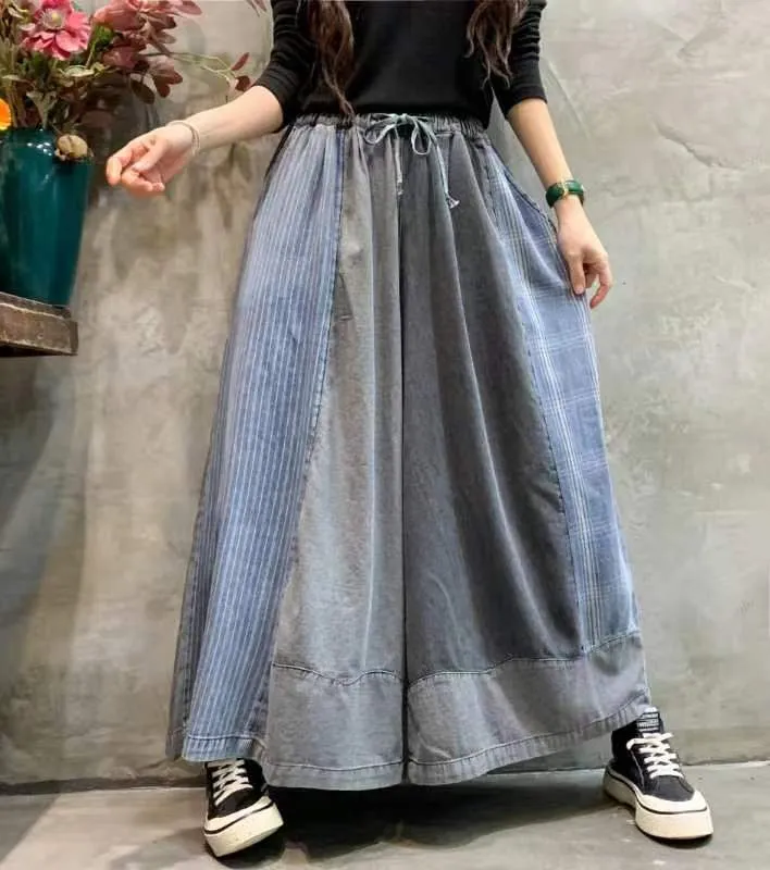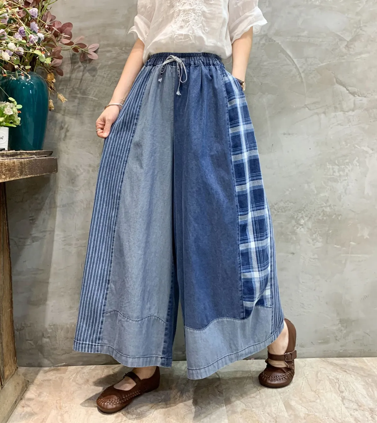 衣都精品- 2023新款文藝復古拼色大碼做舊闊腿褲