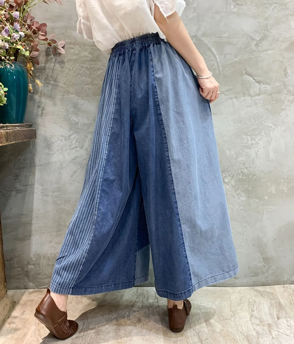 衣都精品- 2023新款復古拼色柔軟鬆緊腰牛仔闊腿褲