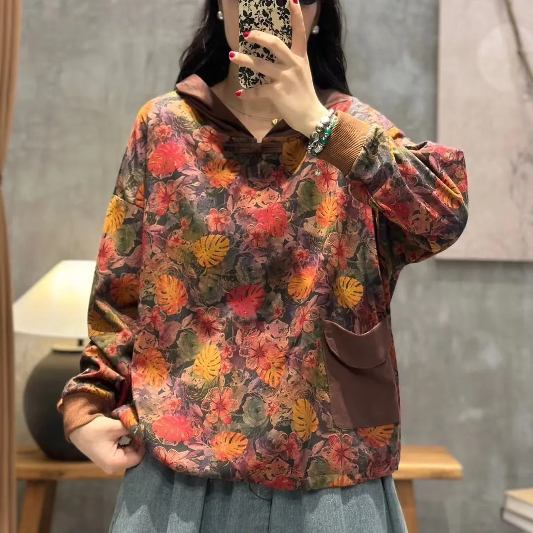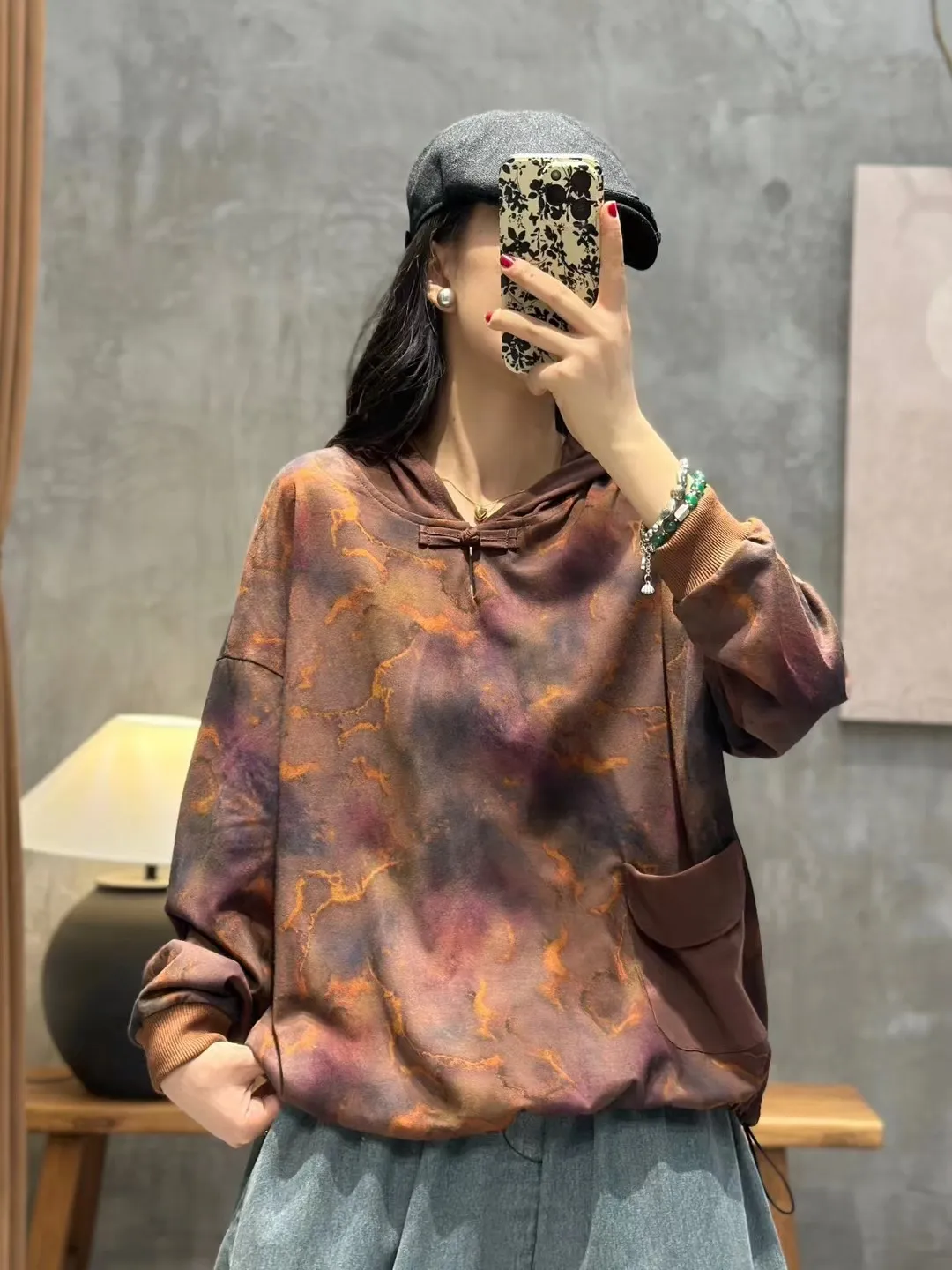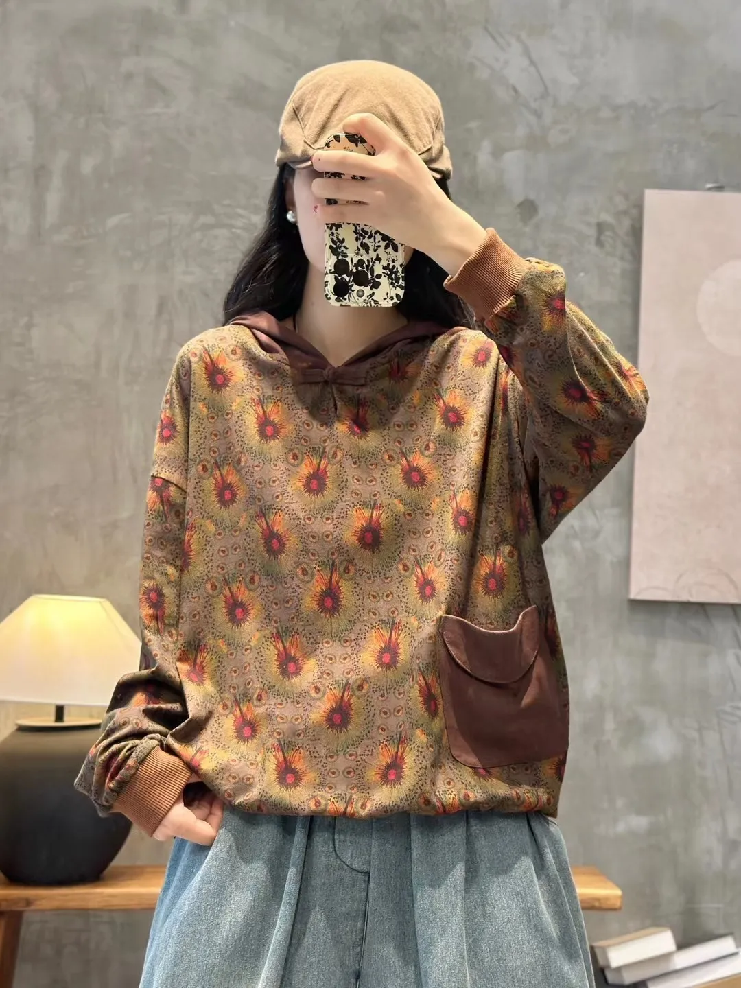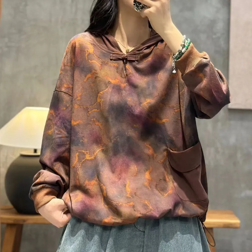 衣都精品- 2023新款文藝風連帽盤扣寬鬆長袖上衣