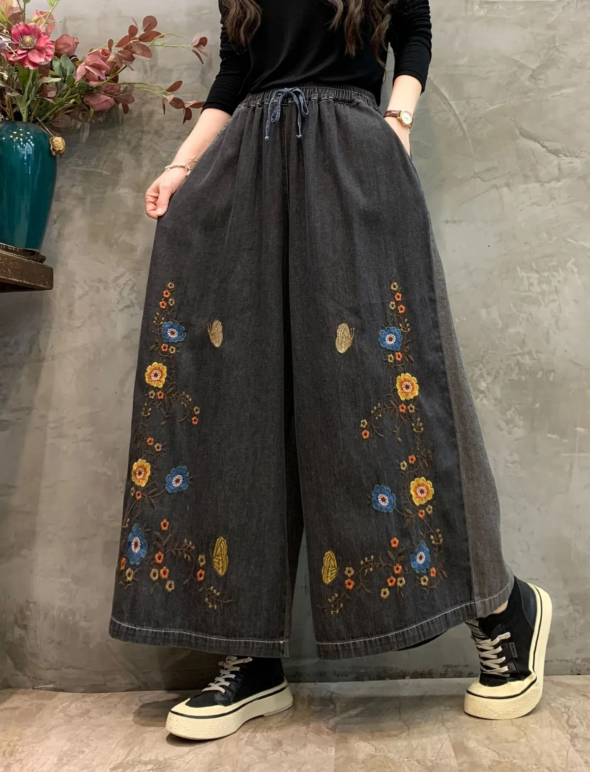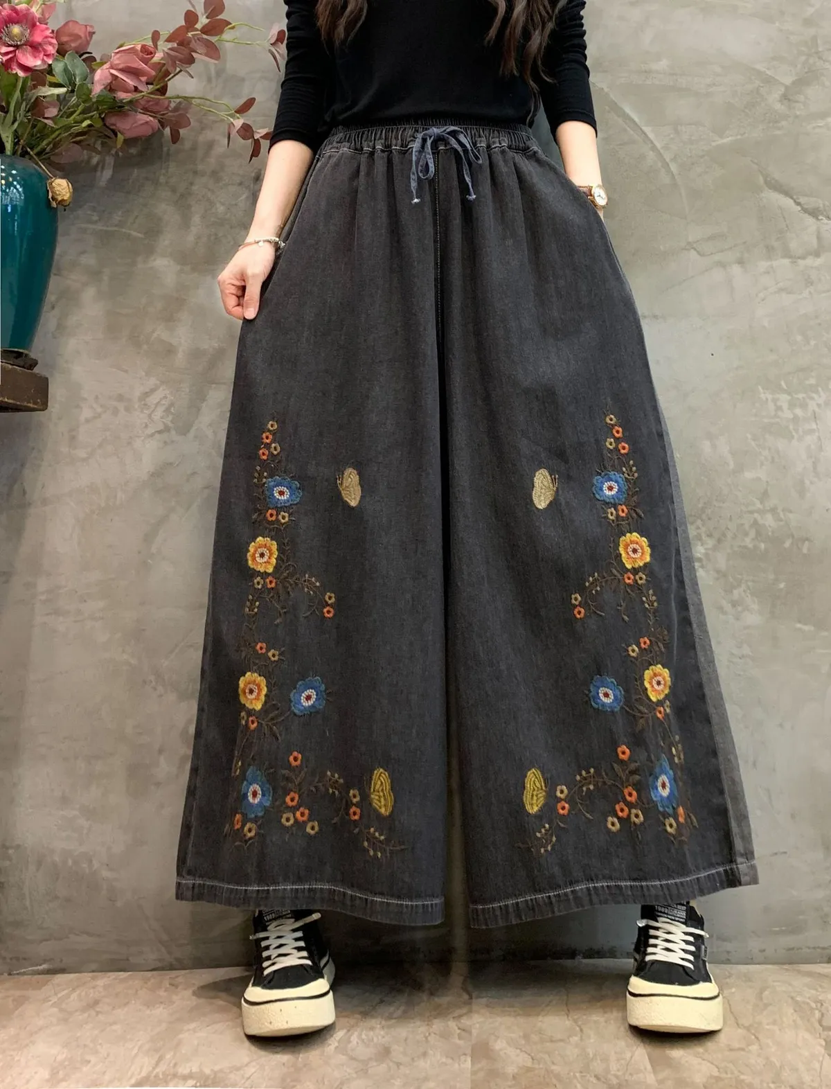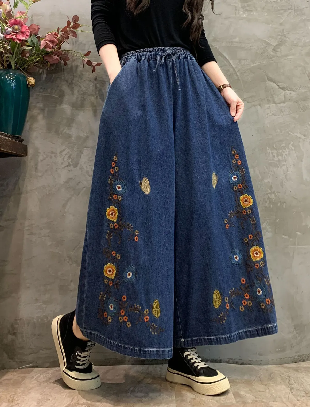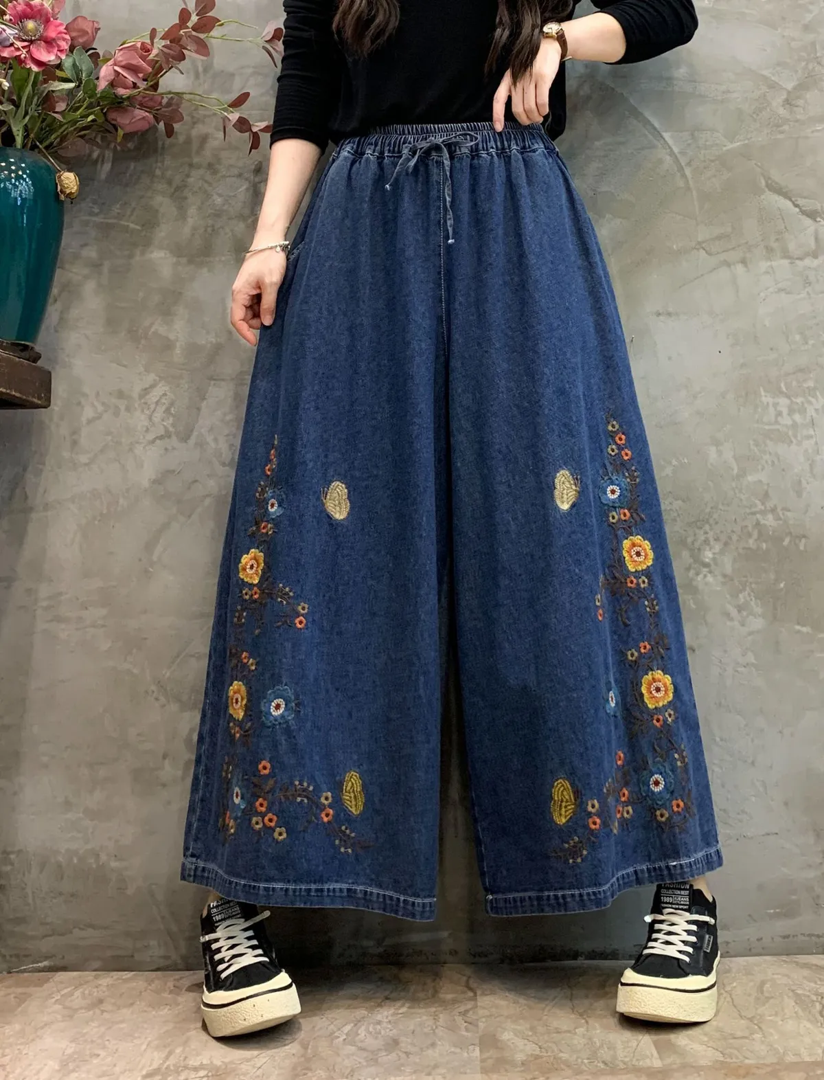 衣都精品- 2023新款時髦休閒花朵刺繡牛仔寬褲
