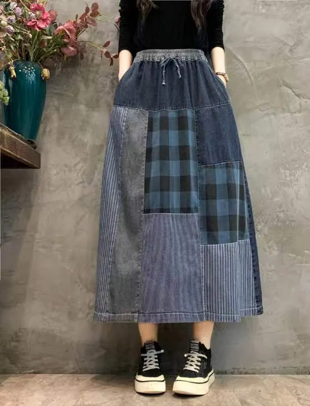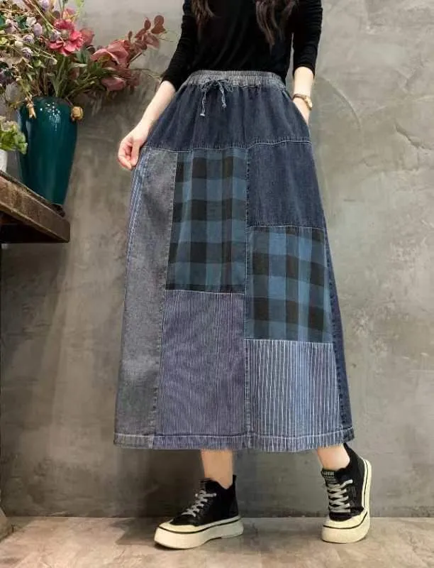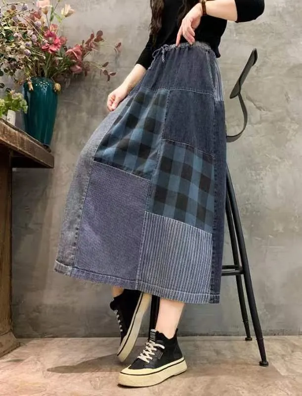 衣都精品- 2023新款休閒文藝寬鬆拼接貼布抽繩牛仔裙