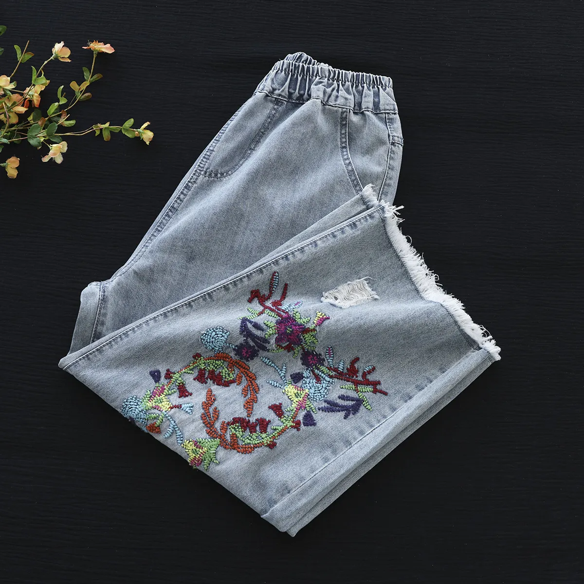 衣都精品- 新款毛邊設計刺繡破洞九分直筒闊腿褲