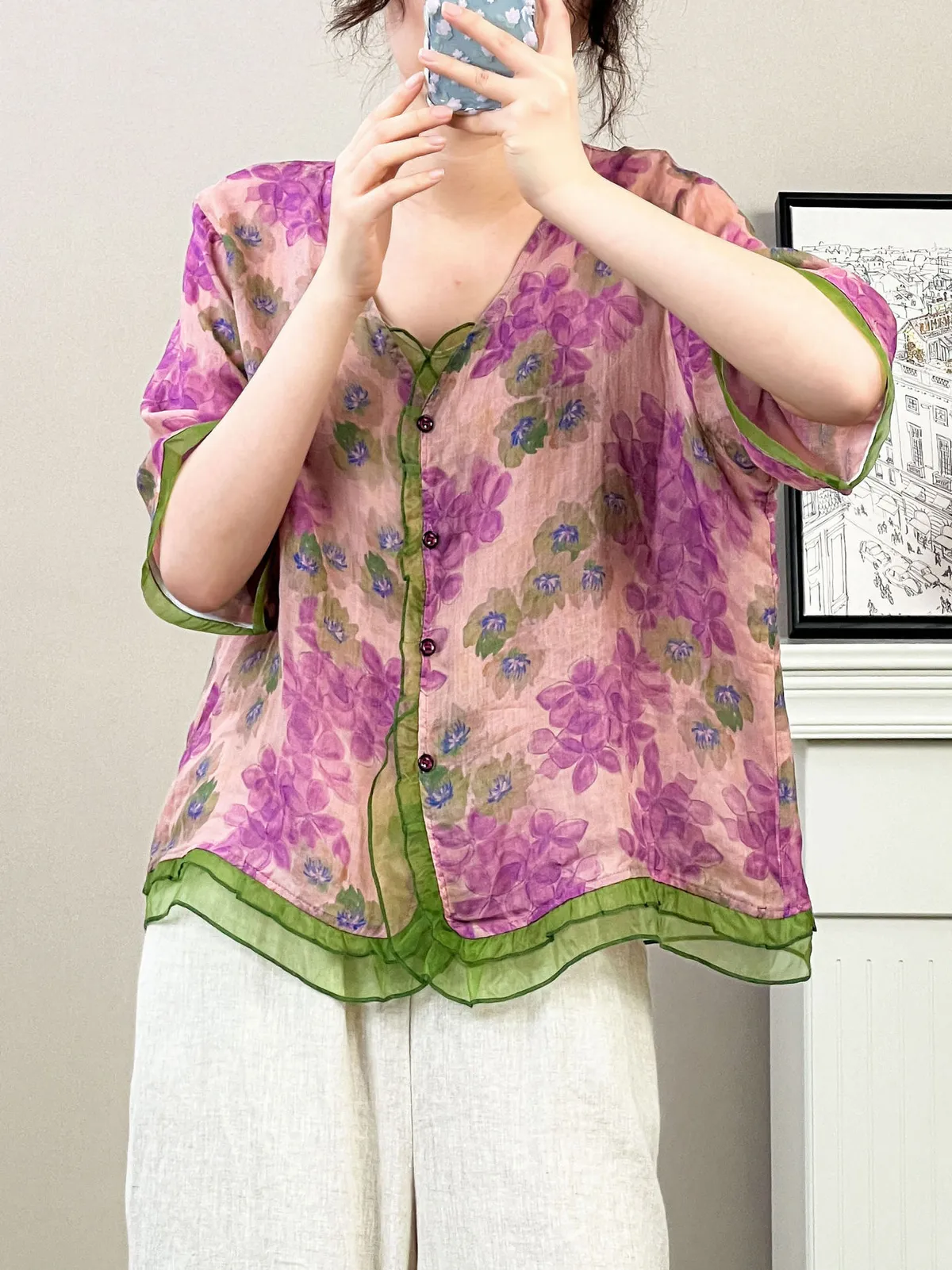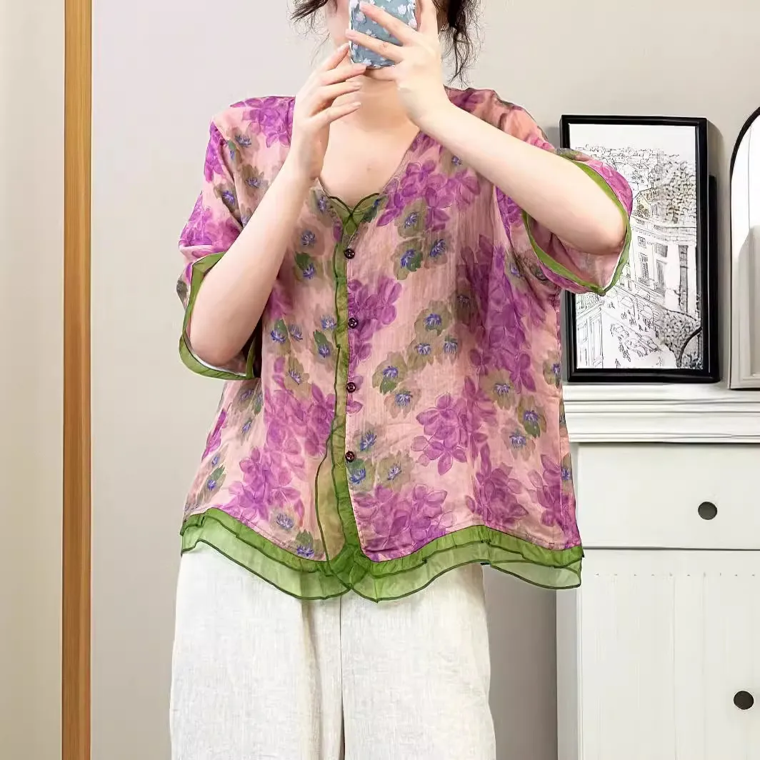 衣都精品- 新款文藝復古印花V領開襟寬鬆上衣