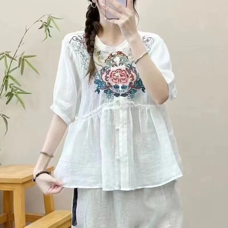 衣都精品- 新款重工刺繡娃娃衫木耳邊開襟盤扣上衣