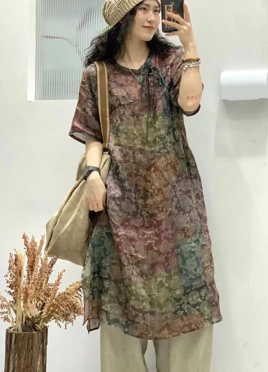 衣都精品- 新款復古文藝薄款印花寬鬆顯瘦V領連衣裙