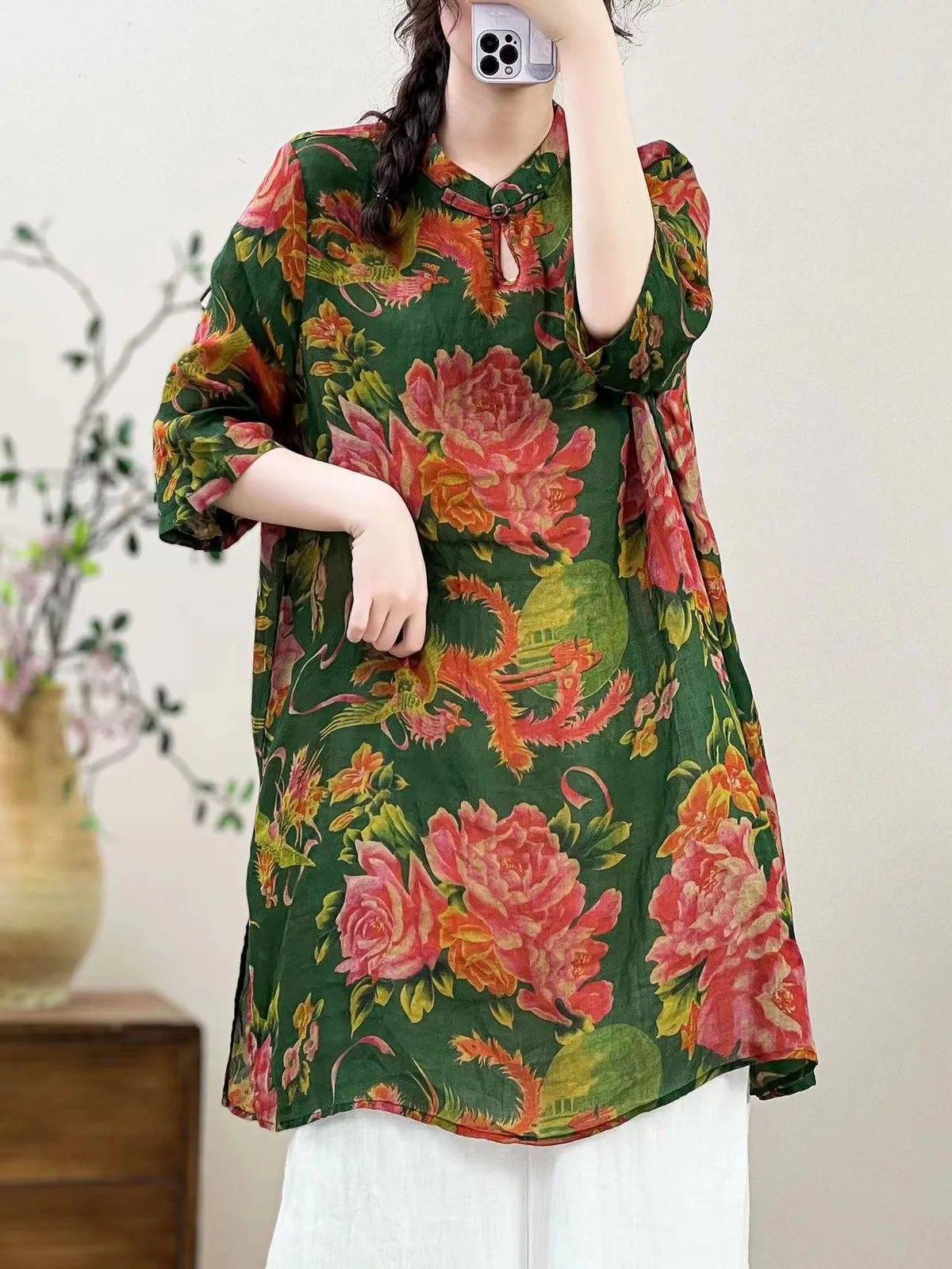 衣都精品- 新款復古立領印花盤扣雙開叉七分袖上衣